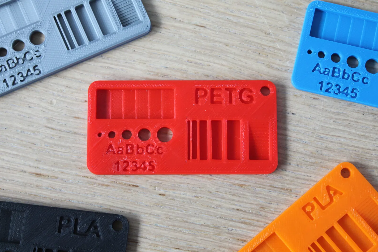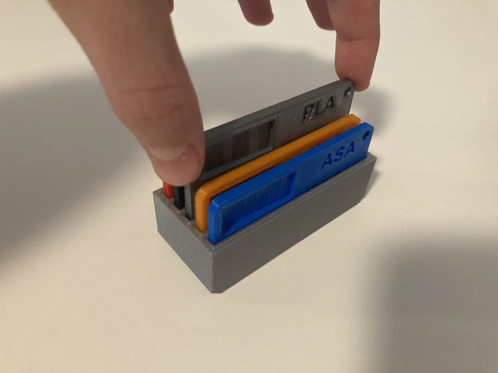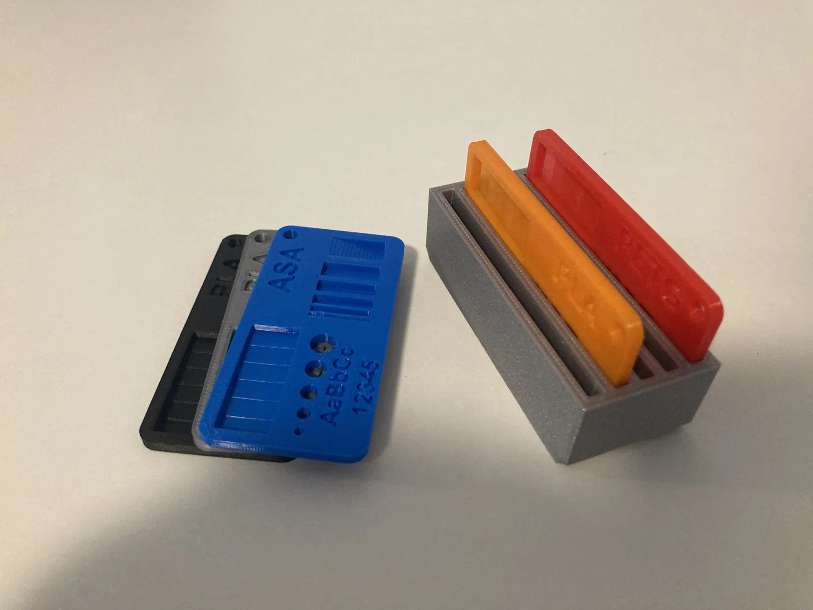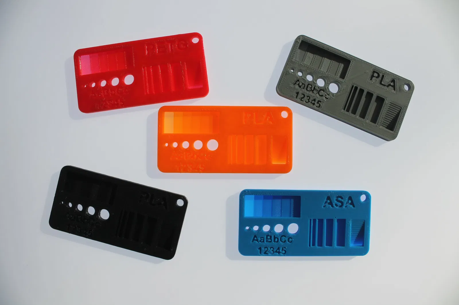 Mẫu filament với chỉ số và bài kiểm tra, bao gồm nhiều loại filament khác nhau. Kích thước nhỏ gọn, dễ lưu trữ và sử dụng.