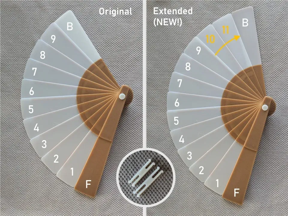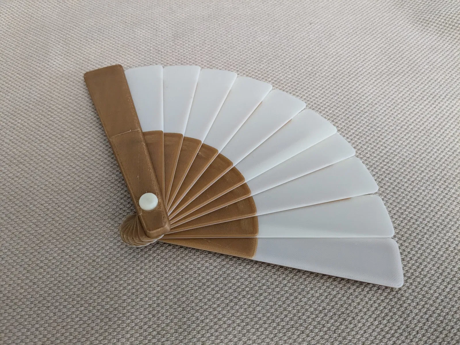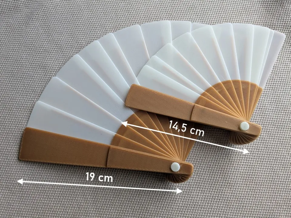 Tôi đã tạo ra thiết kế này được lấy cảm hứng từ những chiếc quạt tay truyền thống làm bằng gỗ và giấy (hoặc vải): Các tấm bảo vệ phía trước và phía sau nặng hơn, bảo vệ các lưỡi quạt khi quạt được gập lại, nhưng cũng thêm một chút trọng lượng để nó có thể được mở nhanh chóng bằng một tay. Bằng cách giữ khoảng cách giữa các lưỡi quạt, những cái này có thể được in bằng nhiều màu sắc và với các họa tiết khác nhau, ngay cả khi bạn không có máy in nhiều màu. Kích thước quạt (chiều dài của lưỡi quạt): - S - 14,5 cm