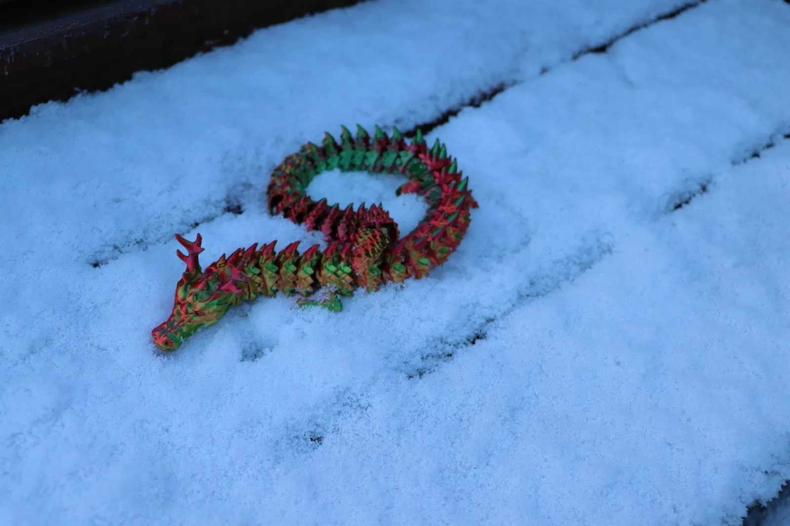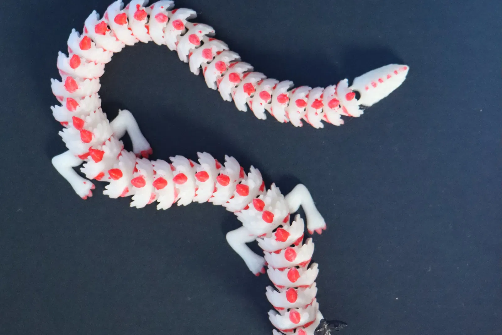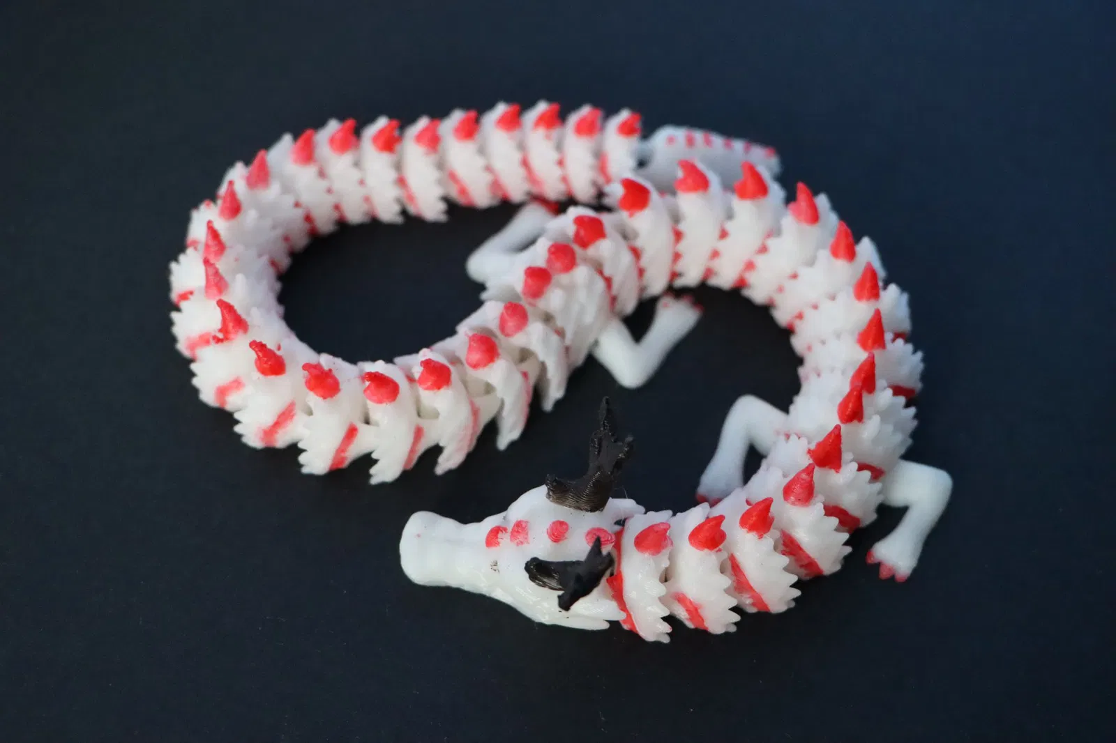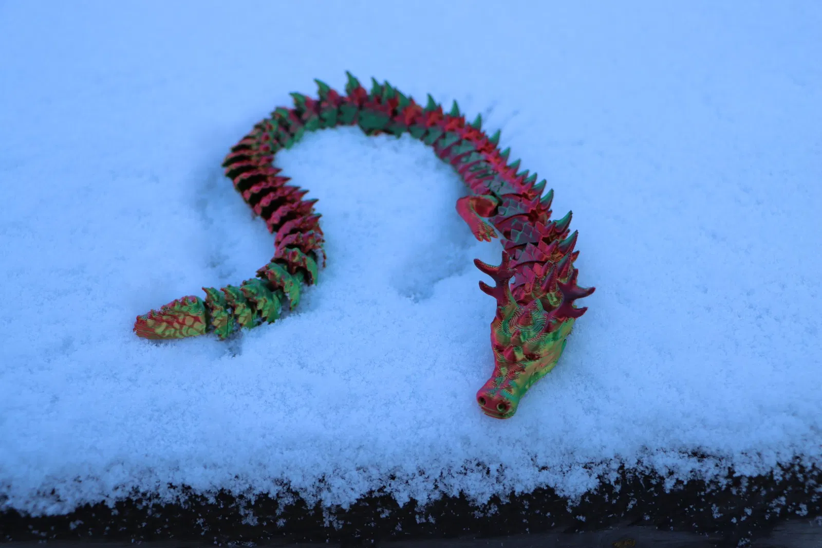 Tôi đã tạo ra 3 biến thể khác nhau của mô hình. Một cái thật dài, mất khoảng 16 giờ để in (trên một máy Ender 3 pro), với 70 khớp (hai trong số đó là khớp đôi), và một cái ngắn hơn một chút mất khoảng 12 giờ (trên một máy Ender 3 pro), với 35 khớp (hai trong số đó vẫn là khớp đôi), và một cái rất nhỏ, với 35 (và lại hai trong số đó là khớp đôi), mất khoảng 6 giờ để in (trên một máy Ender 3 pro). Mô hình rồng dài có chiều dài 56,5 cm tức là khoảng 1 foot 10 inch trong đơn vị đo lường của Mỹ. Rồng ngắn có chiều dài khoảng 39 cm, tức là khoảng 1'3 feet.