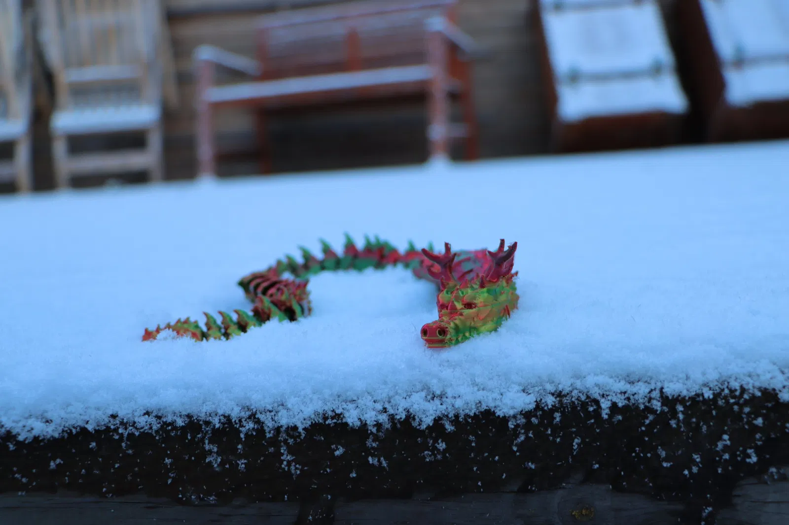 Rồng siêu nhỏ có chiều dài 27,5 cm tức là khoảng 11 inch trong đơn vị đo lường của Mỹ. Toàn bộ con rồng được in thành một mảnh, vì vậy không cần keo và những thứ như vậy. Nó cũng không cần hỗ trợ gì cả. Bạn có thể xem cách nó được in bên dưới: