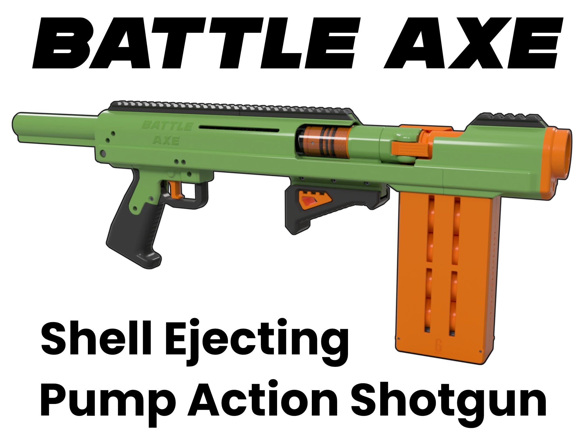 Battle Axe là một khẩu súng shotgun Nerf in 3D có khả năng bắn và thải ra Silly Shells! Hoạt động bằng lò xo, bơm hành động. Đúng vậy, nó thực sự bắn nhiều viên đạn cùng một lúc!