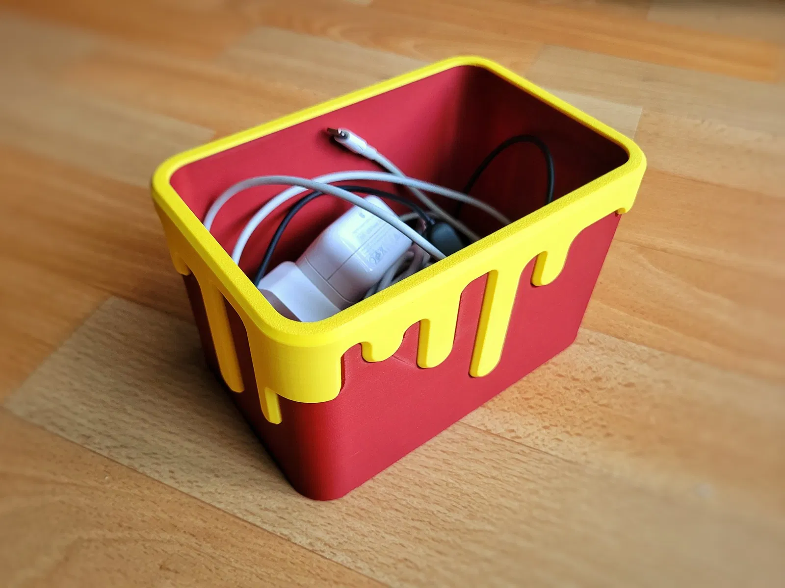 Tôi đã tạo một phiên bản remix của Drippy Box không có tay cầm và lớn hơn một chút, để tất cả các bộ sạc và cáp hàng ngày của tôi có một nơi trông đẹp mắt... Kích thước là 100% ~ 15x10x9,5cm.