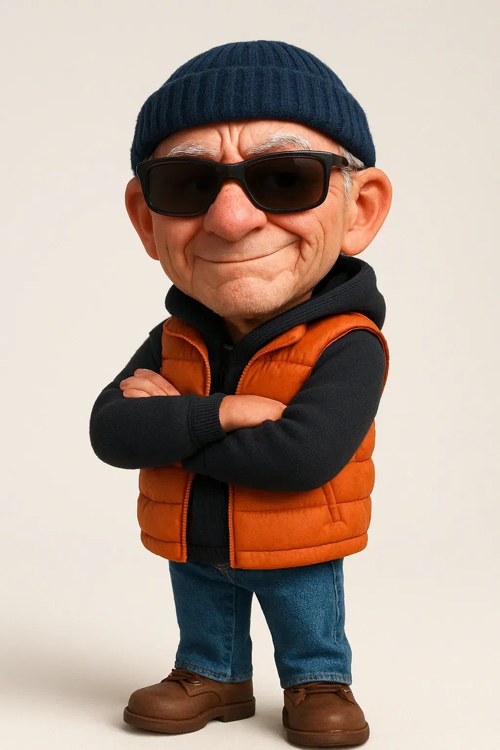 Description : Le personnage est représenté sous forme de figurine 3D, dans un style Pixar. Il est debout, les bras croisés.