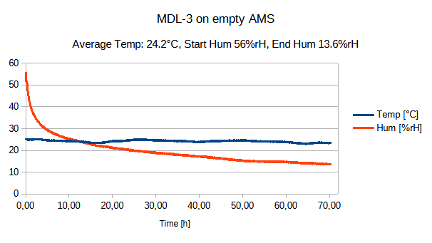 • Hygrometer tùy chọn: https://www.amazon.de/dp/B0CH7XS97M Nếu gasket cao su hoặc hygrometer không có sẵn trong khu vực của bạn, một bộ hoàn chỉnh với màng MDL-3, nguồn USB-C, gasket và tất cả các bộ phận cần thiết (vít, vòng đệm, đai ốc, kết nối phẳng) để lắp ráp có sẵn tại đây. ### Tăng Oxygen Bên Trong và Nguy Cơ Cháy…? Mật độ không khí ở mực nước biển và 20°C là 1.204kg/m^3. Tỷ lệ Oxygen là 20.94% vì vậy chúng ta có 252.1g Oxygen trong 1m^3 không khí. Độ ẩm tương đối 60%RH ở 20°C tương ứng với độ ẩm tuyệt đối là 10.37g/m^3. Khi chúng ta giảm độ ẩm này xuống 10%RH, tương ứng với 1.73g/m^3, chúng ta đã tách 8.64g H2O thành Hydro và Oxygen và vận chuyển Hydro ra bên ngoài. H2O được cấu thành từ 2x Hydro với khối lượng phân tử là 1g/mol và 1x Oxygen với 16g/mol, vì vậy phần Oxygen của 8.64g H2O trên là 7.68g. Do đó, chúng ta đã tăng tổng lượng Oxygen trong 1m^3 từ 252.1g lên 259.8g và do đó tăng tỷ lệ từ 20.94% lên 21.6%. Với sự gia tăng tối thiểu này, không cần phải lo lắng về bất kỳ tác động tiêu cực nào của nồng độ Oxy bên trong một hộp lưu trữ dựa trên màng Rosahl. ### Nhận xét Vâng, các màng Rosahl không rẻ nhưng chúng cực kỳ hiệu quả khi nói đến mức tiêu thụ điện năng với dưới 4W liên tục. Tôi để chúng hoạt động 24/7 mà không cần phải làm khô lại một cuộn chỉ trong một máy sấy filament thông thường hoặc lò nướng, điều này sẽ yêu cầu nhiều năng lượng hơn đáng kể.