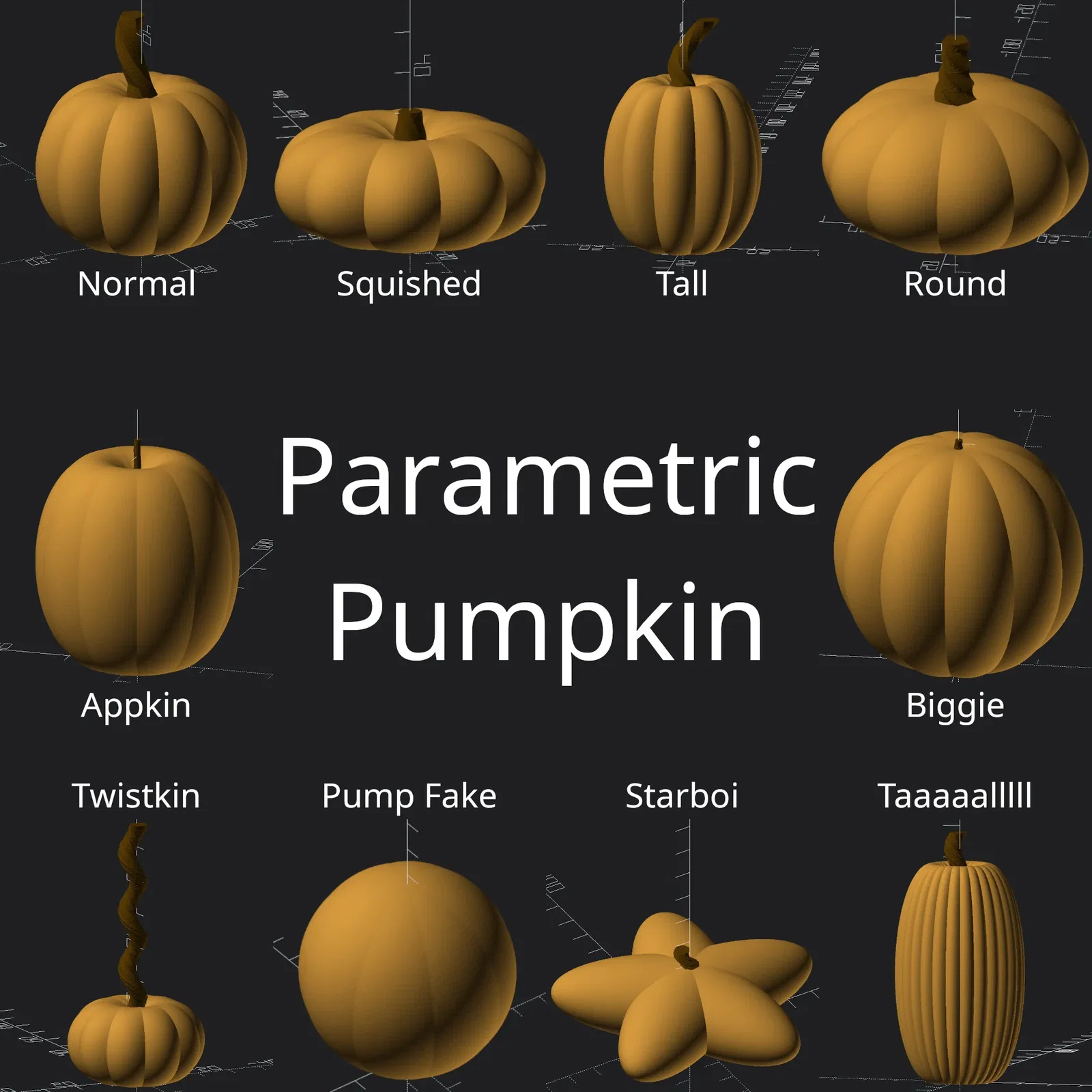 Mô hình bí ngô parametric thú vị, dễ tạo hình theo sở thích. Có thể in 3D với nhiều kiểu dáng như bí ngô cao, béo, hoặc giống táo.