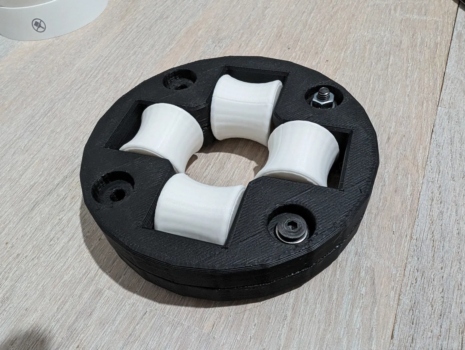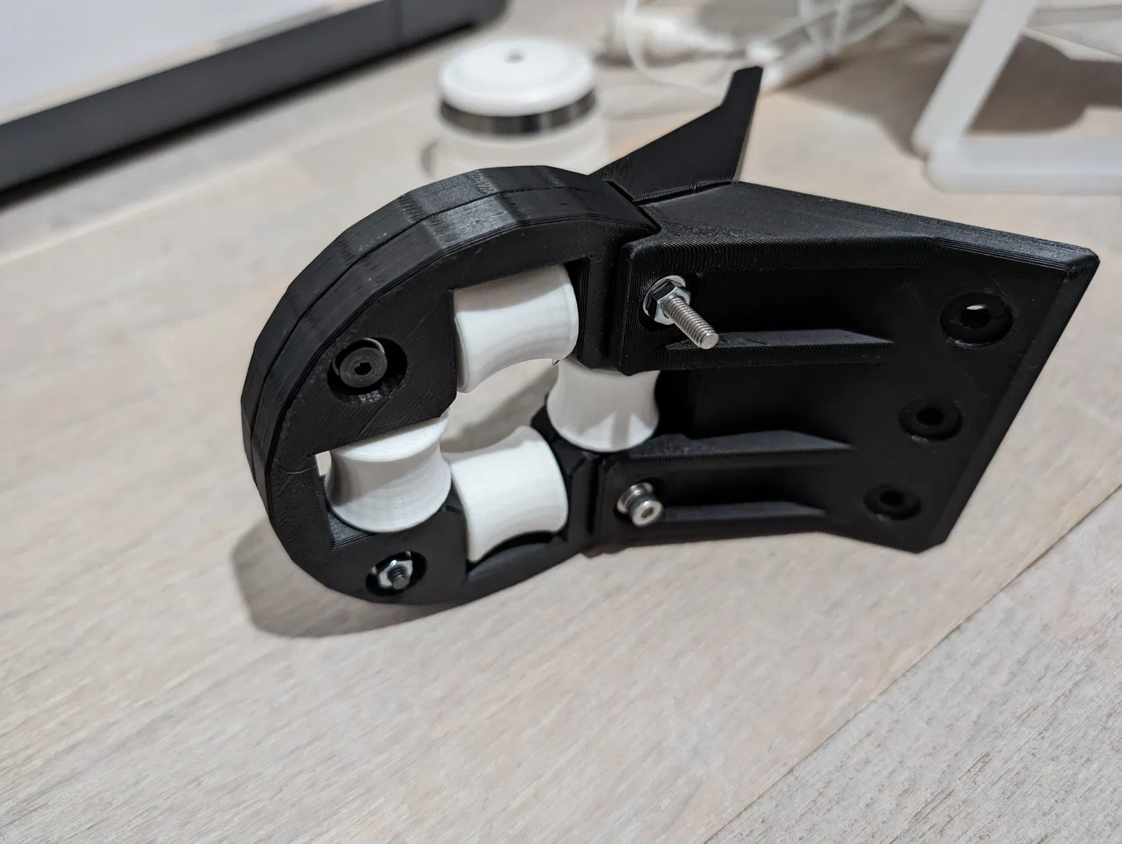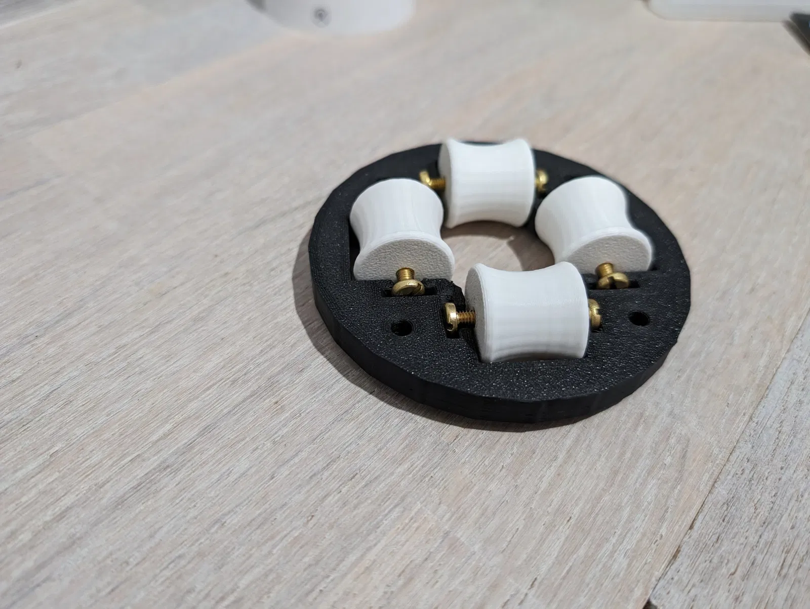 - Gắn 2 bu lông đồng vào mỗi con lăn, khoảng cách giữa các đầu bu lông ra khỏi thân con lăn, đủ rộng để ngồi vào các khe trong giá đỡ con lăn.