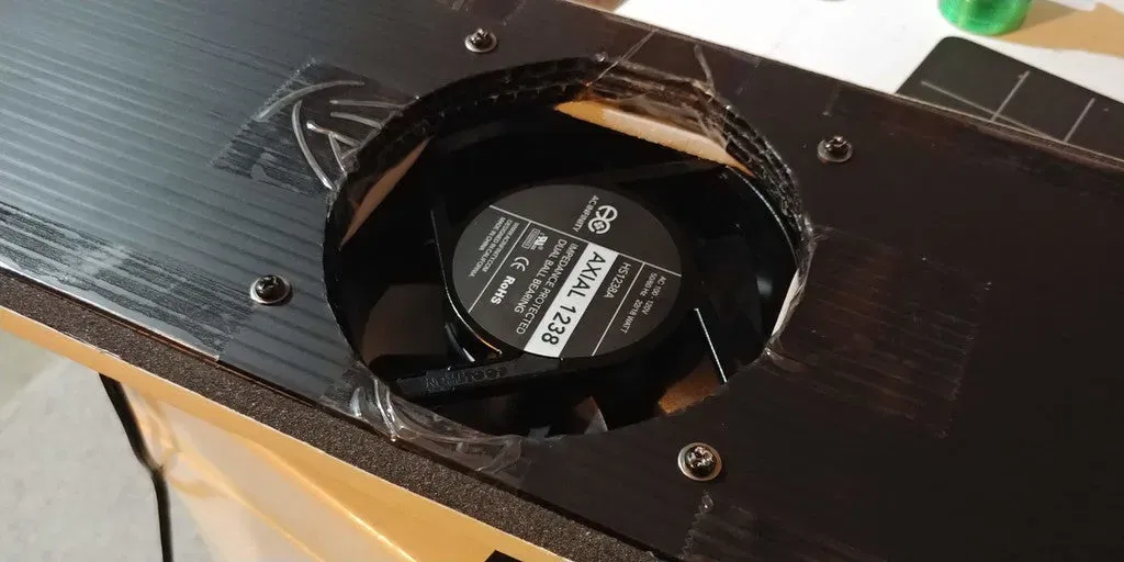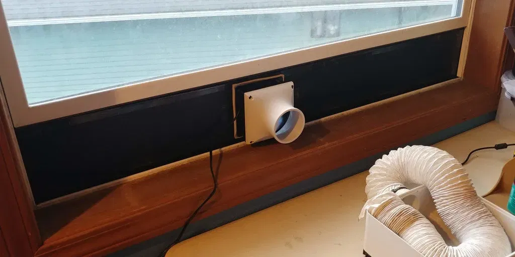 10. Quạt được gắn vào phần chèn cửa sổ (làm từ coroplast tôi có sẵn) với một chút gioăng cửa sổ để hỗ trợ.