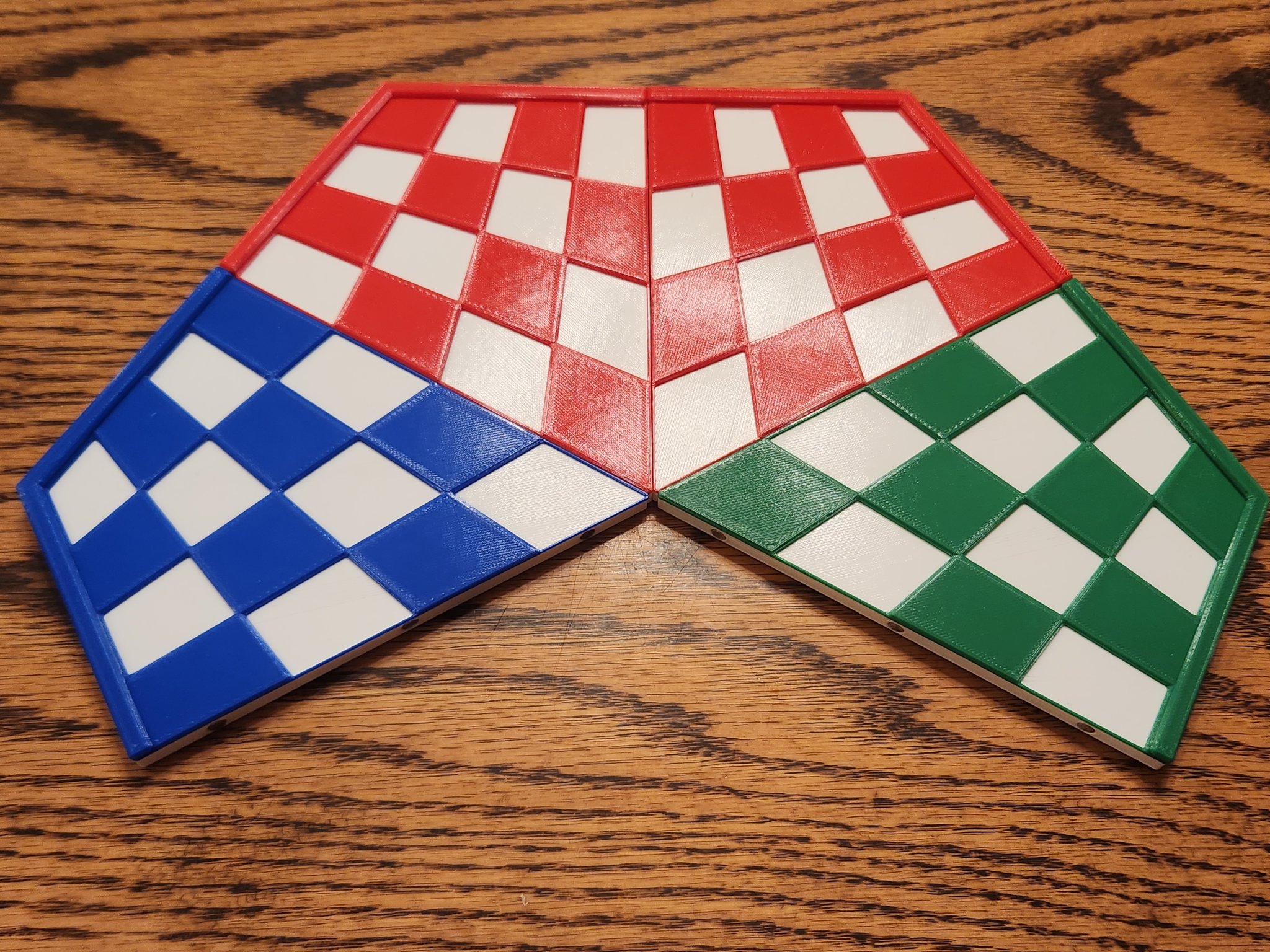Các phần của bàn cờ được giữ chặt với nhau bằng nam châm hình trụ 4x2mm, dễ dàng có sẵn trực tuyến. Để có bàn cờ đa màu, có thể lập lịch thay đổi màu sắc trong quá trình in. Các quân cờ trong hình là quân cờ hình lục giác tỉ lệ 50% có sẵn tại đây: