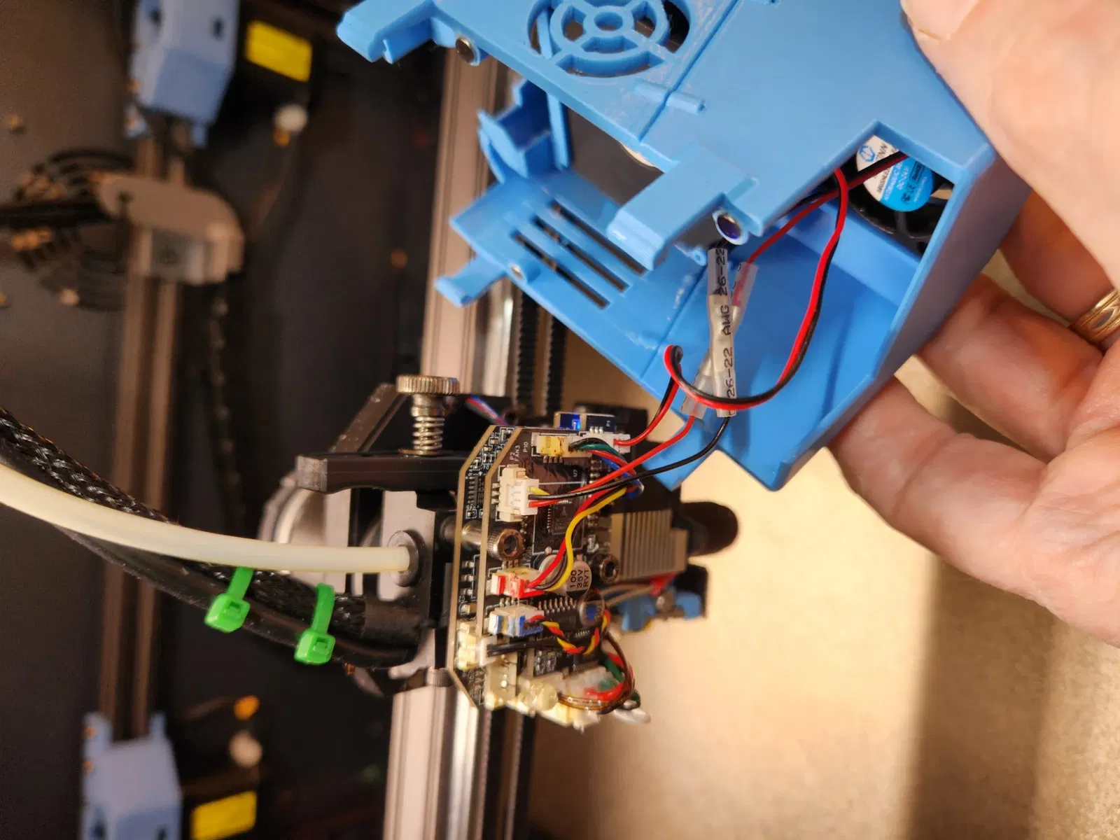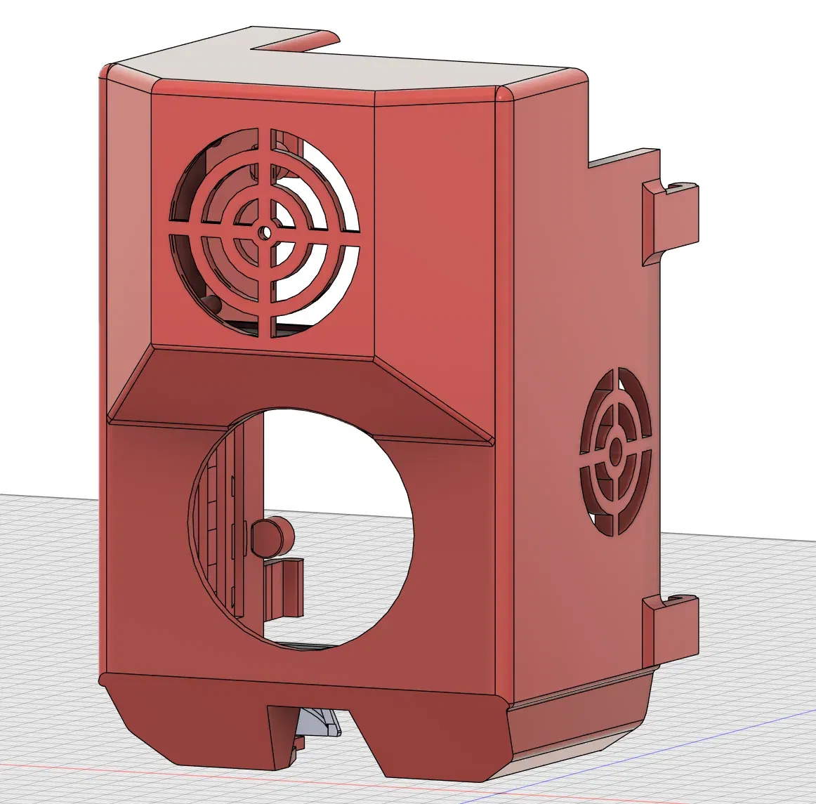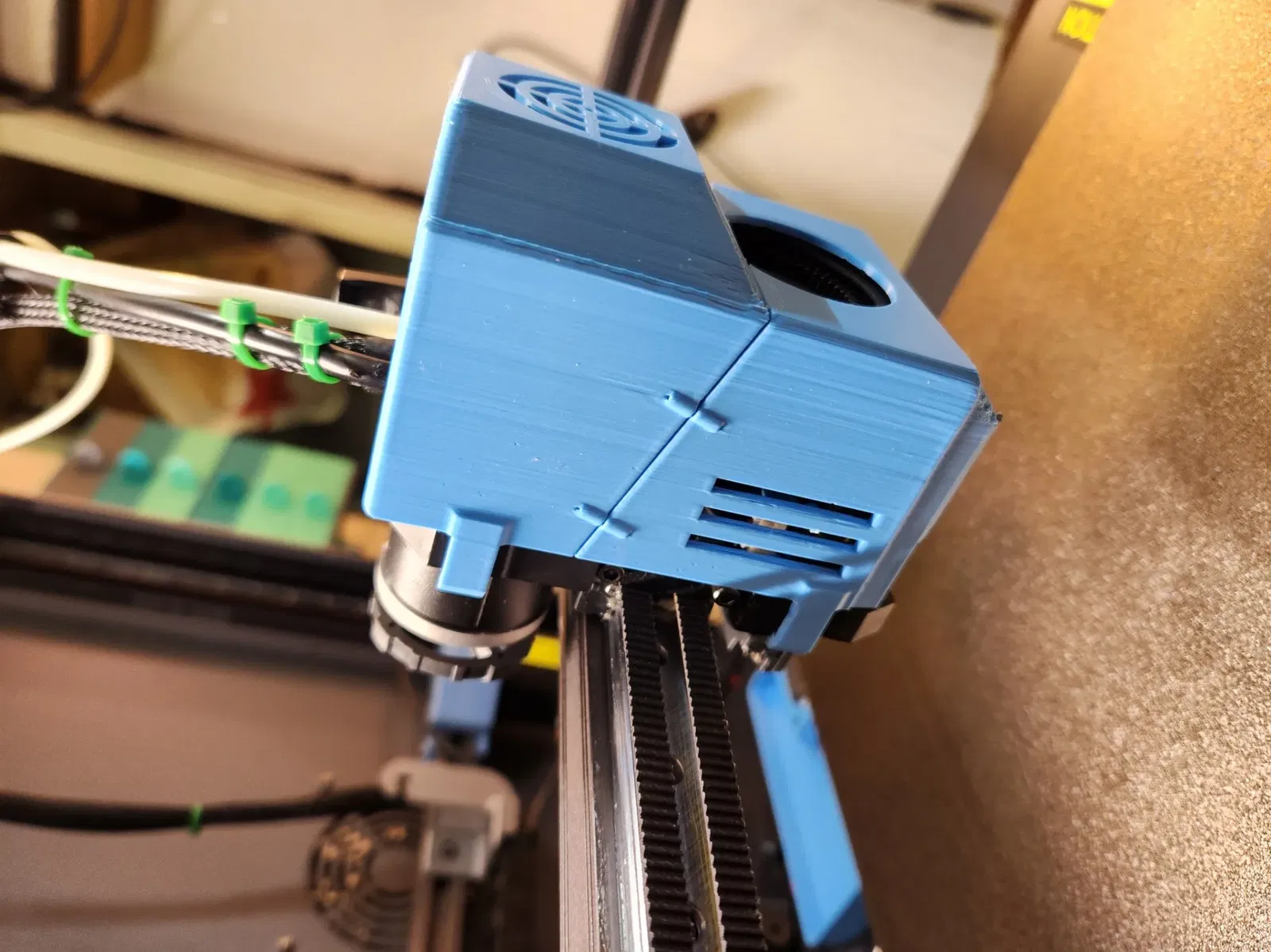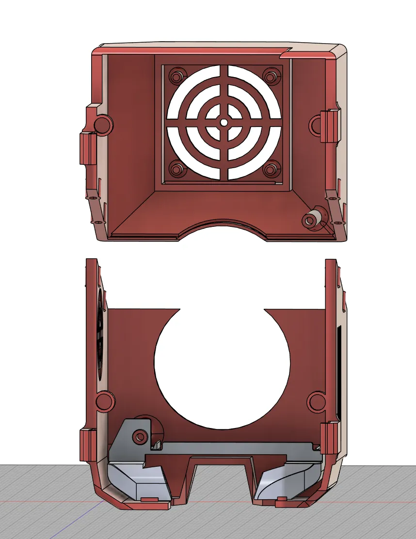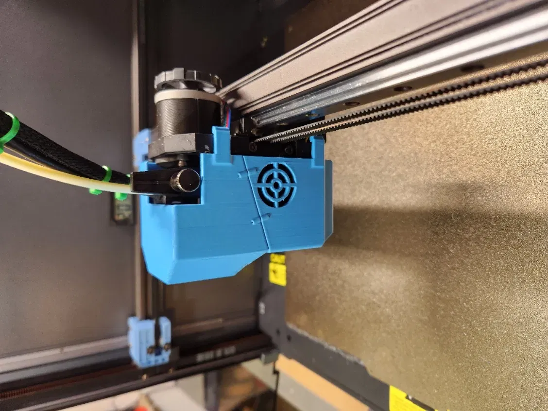 Nắp extruder với một khe cho quạt 3010 cho đầu công cụ và các tab giúp giữ nắp lại.