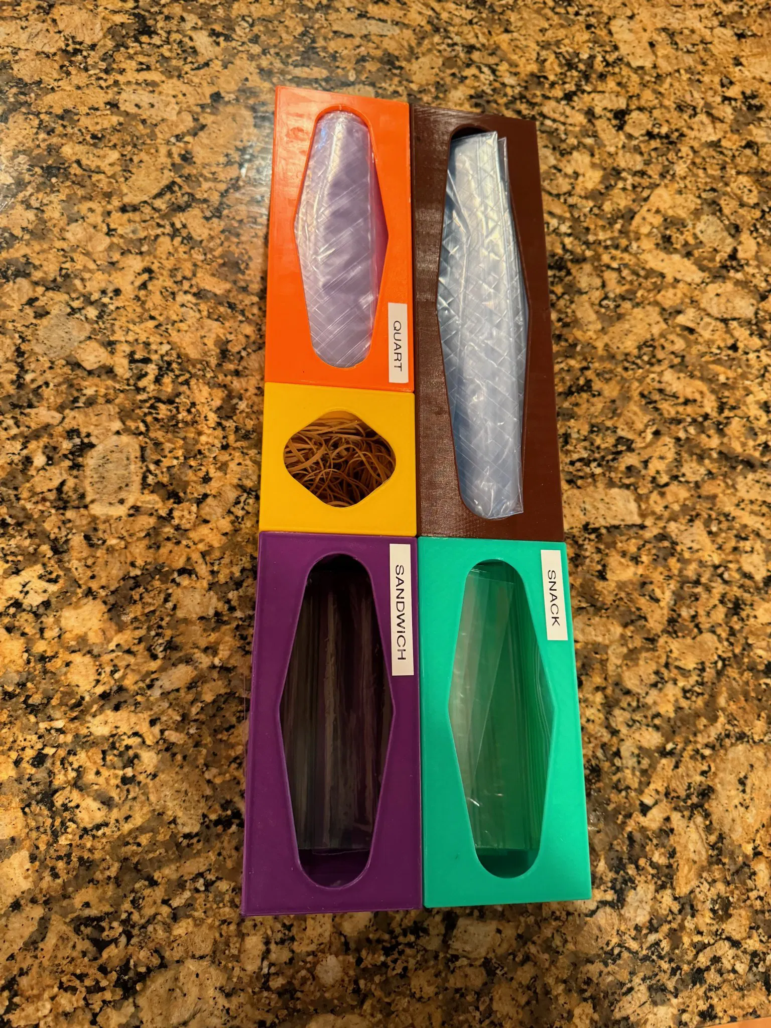 Hộp đựng và phân phát túi ziplock tiện lợi cho ngăn kéo bếp. Thiết kế có thể điều chỉnh kích thước, dễ lắp ráp và tiết kiệm không gian.