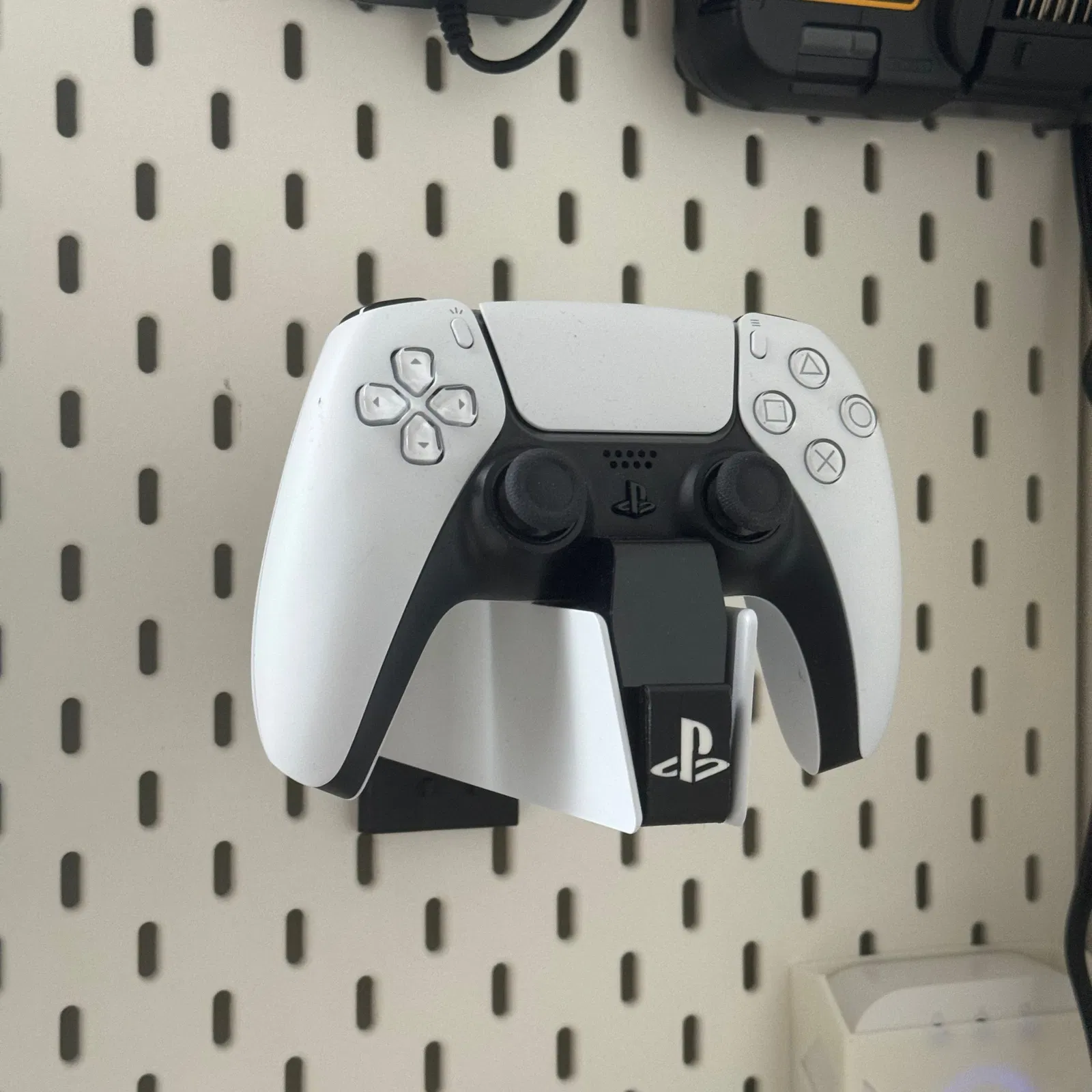 Một giá đỡ để giữ bộ sạc DualSense trên bảng Skadis của Ikea với/không có móc để quản lý cáp điện.
