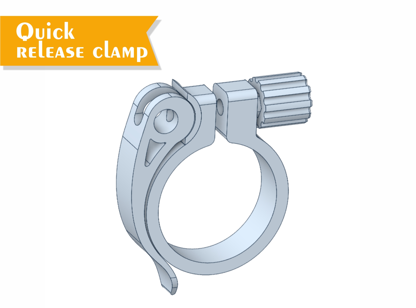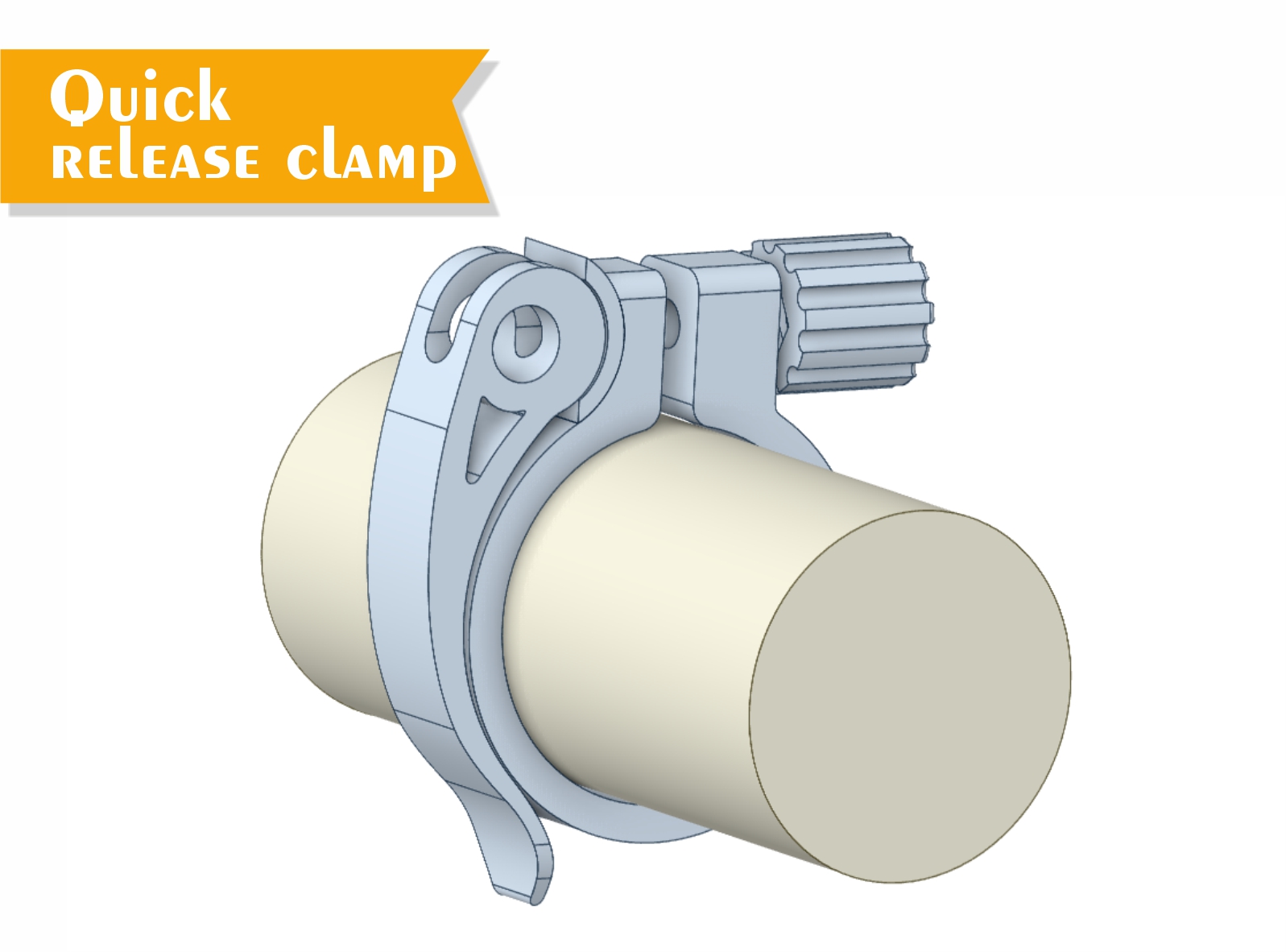 Kẹp nhả nhanh được thiết kế để gắn vào thiết bị. Có thể chỉnh sửa và sử dụng với bu lông kết nối đồ nội thất M6 hoặc chỉ vít và đai ốc. Các tệp **step** cũng được cung cấp để biết thêm chi tiết và độ chính xác khi in.