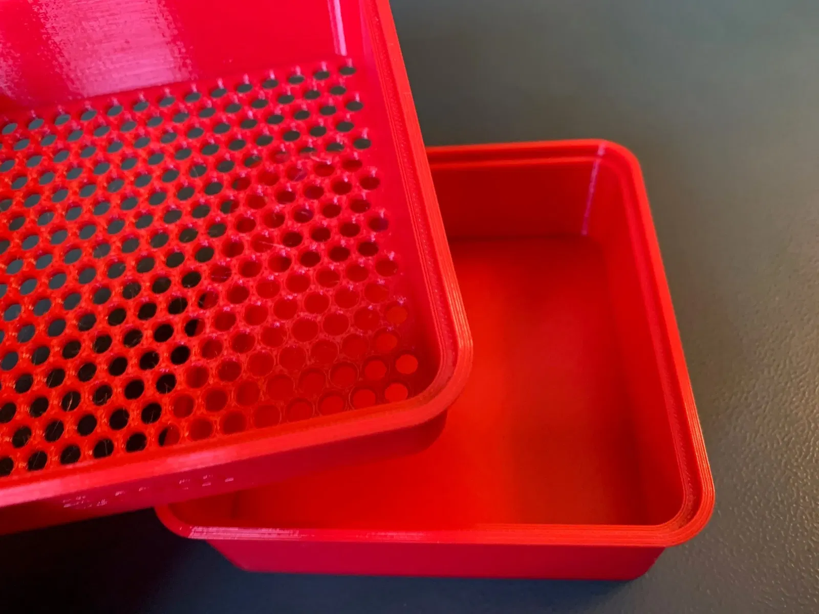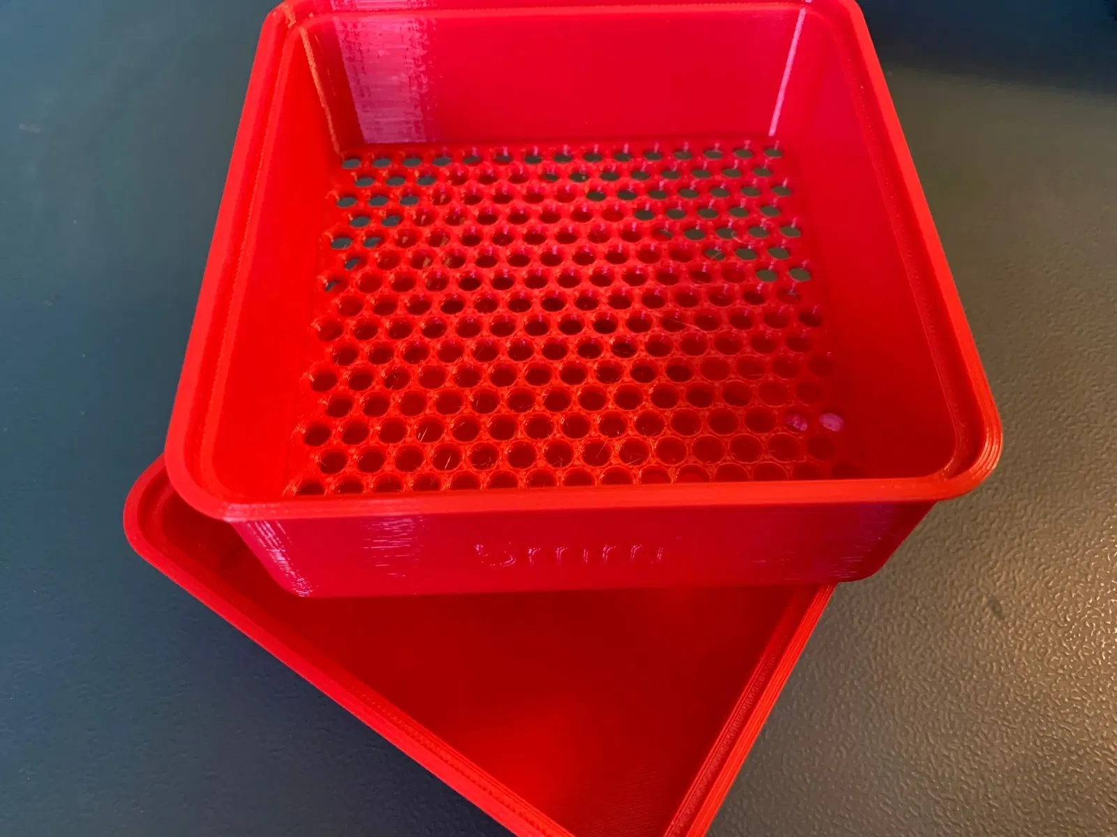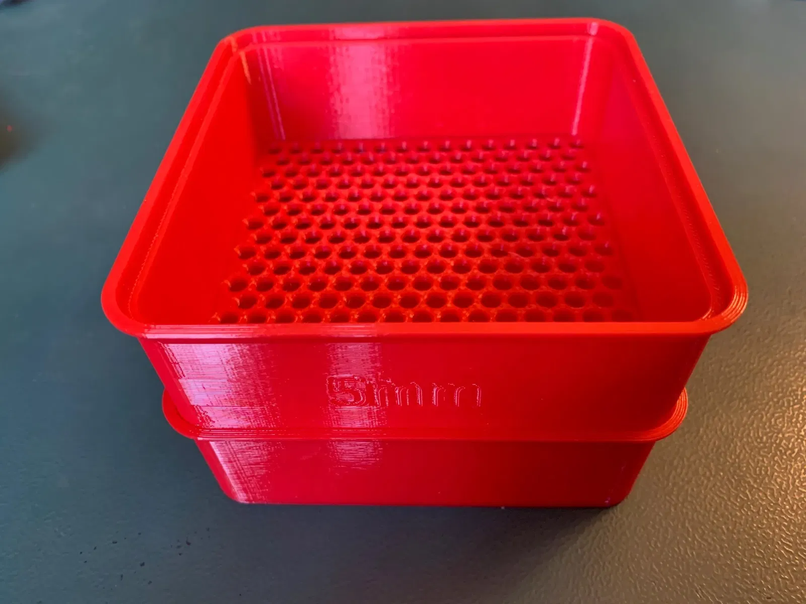 Tôi đã in các cái sàng của mình bằng PETG với chiều cao lớp 0.3 và không có giá đỡ. Tôi đã bao gồm các tệp STL cho kích thước lỗ 5, 10 và 15mm cũng như một khay cơ sở không có lỗ. Các cái sàng có thể chồng lên nhau và sẽ in một số cái với kích thước lỗ khác nhau. Nếu bạn muốn kích thước khác, đoạn mã có thể tạo ra chúng.