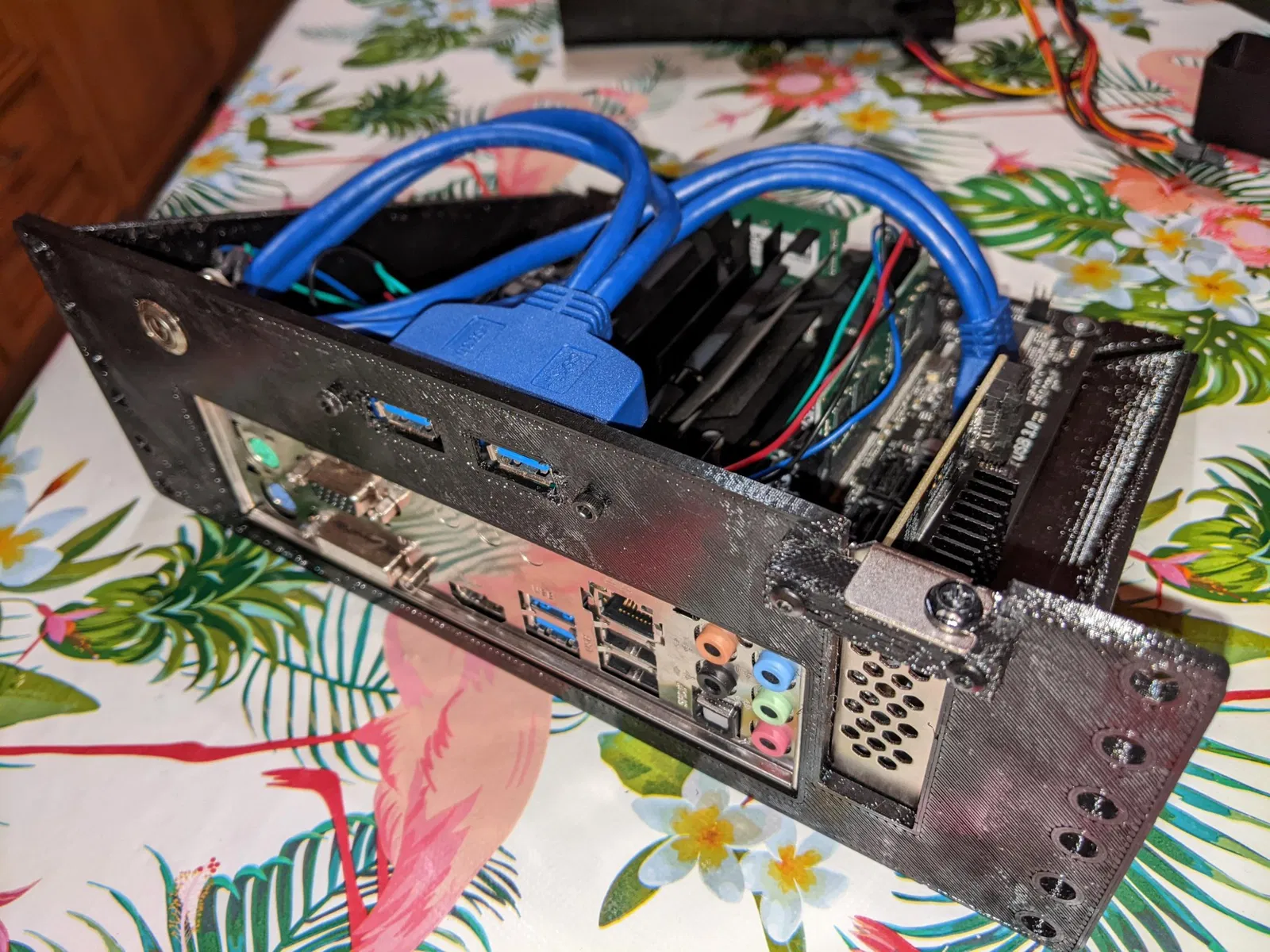 Tôi đã in nó bằng PETG với tấm trước nằm trên giường và không cần hỗ trợ. Mảnh thêm là một giá đỡ để lắp đặt các thẻ PCIE có độ cao thấp. Nó phải được vít vào tấm trước bằng hai vít M3x12 mm (hoặc dài hơn).