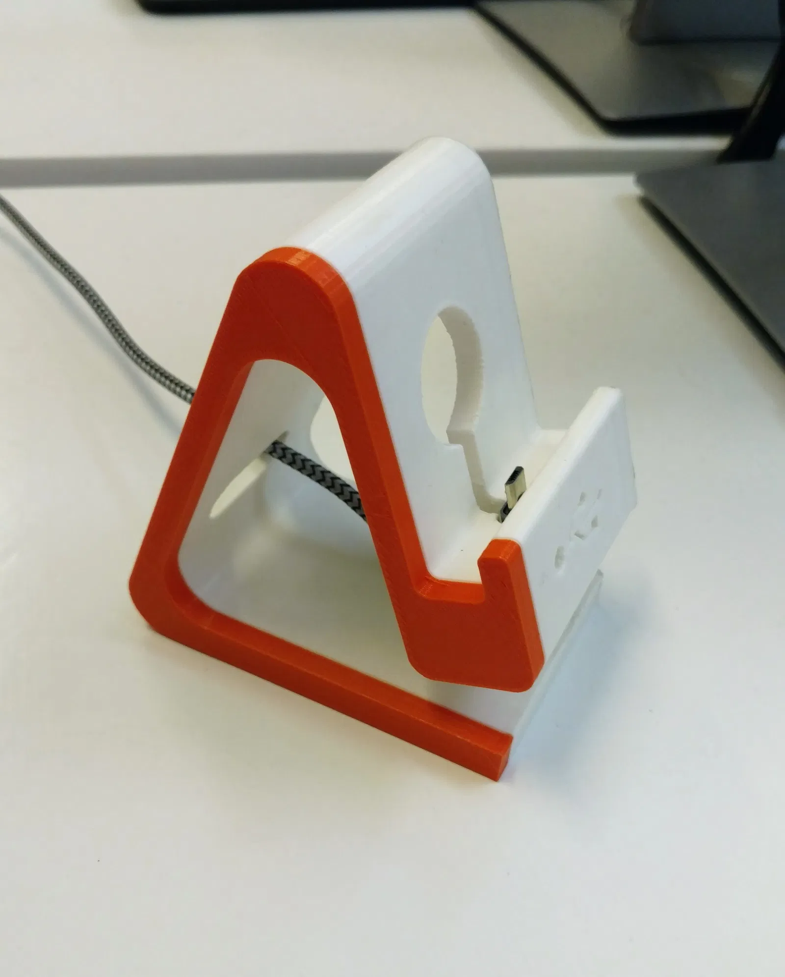 Giá đỡ điện thoại cho Android và iPhone có khe tích hợp để luồn dây sạc. Có thể đảo ngược vị trí dây cáp cho phù hợp với thiết bị của bạn. Lỗ luồn dây cáp hơi lớn, bạn có thể tùy chỉnh nếu cần.
