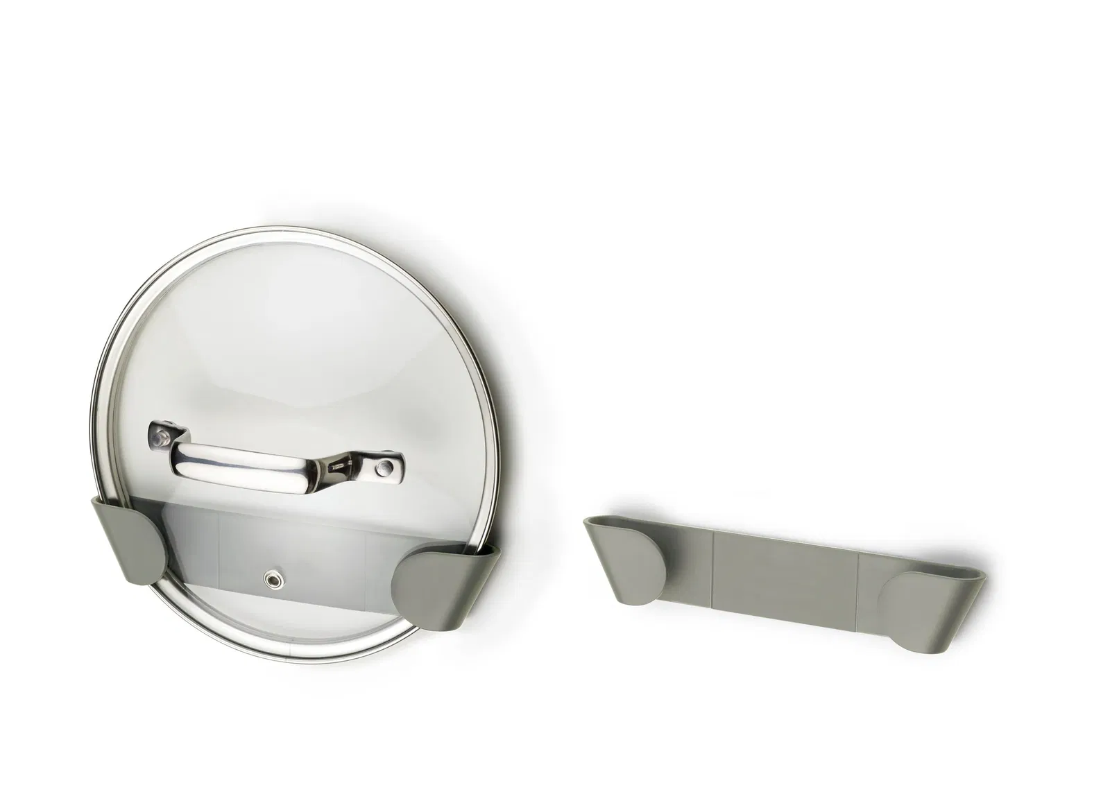 Một giá đỡ để treo vung nồi vào bên trong cánh cửa tủ bếp. Dễ dàng lắp đặt bằng băng dính M2 hoặc keo nến, lý tưởng cho việc tổ chức không gian bếp gọn gàng hơn.