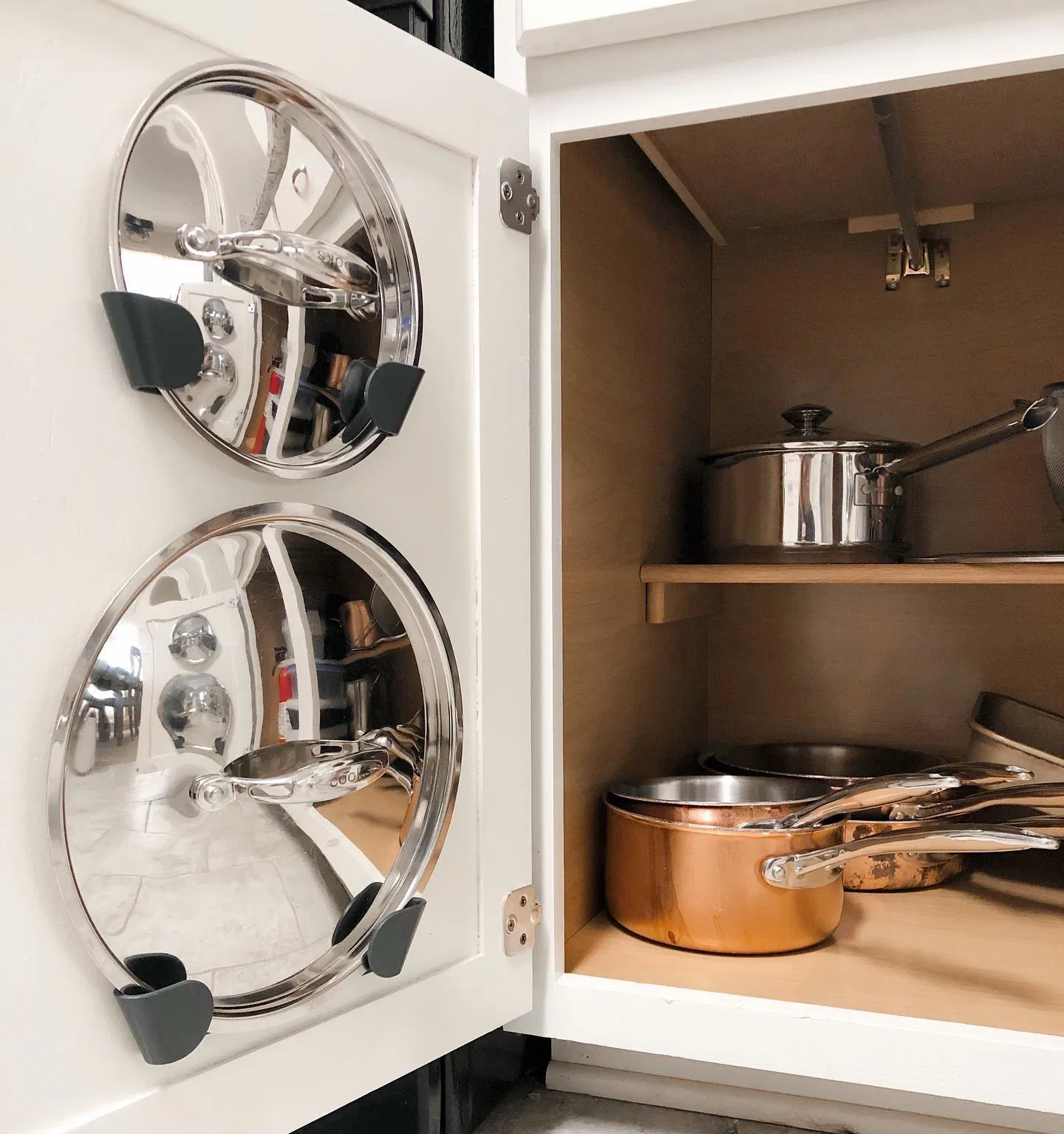 Giá đỡ vung nồi để sắp xếp tủ bếp. Dễ dàng dán vào cửa tủ bằng băng dính hai mặt M2 loại chịu lực cao, hoặc bằng keo nến.