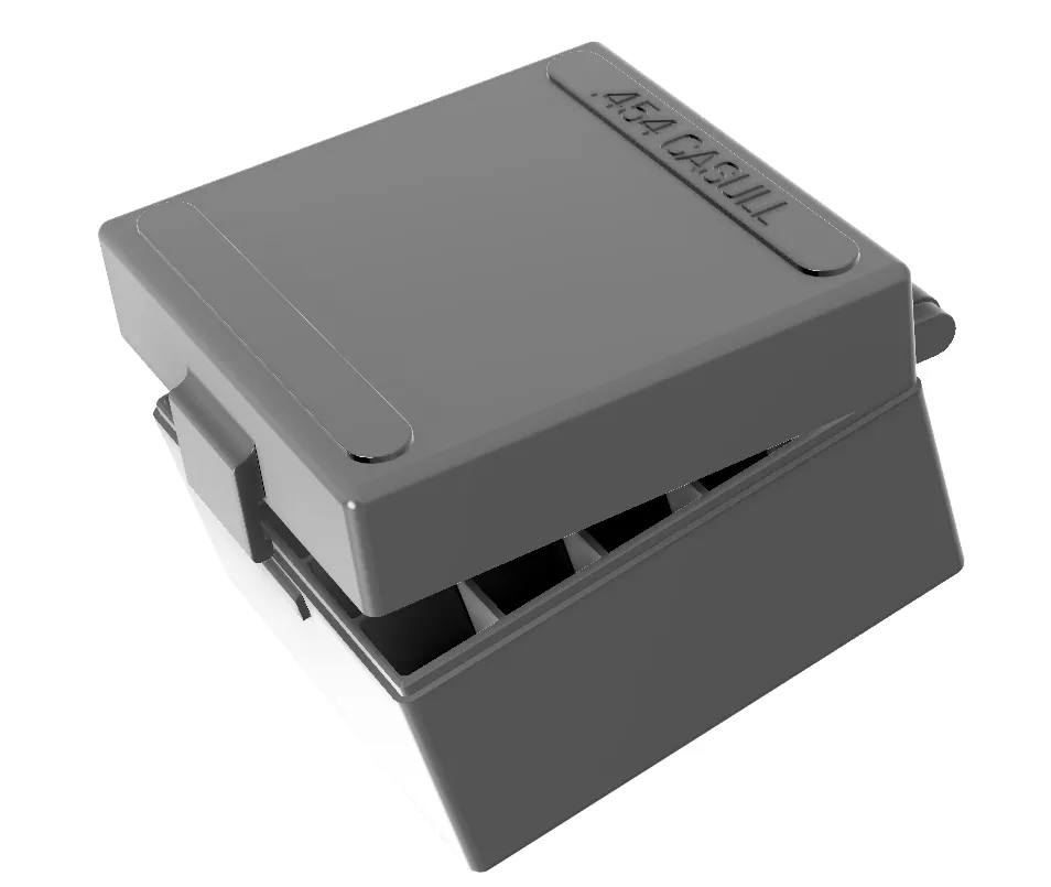 Một hộp đạn có thể xếp chồng lên với nắp có bản lề và bị khóa. Phù hợp với đạn lớn .45 cal (ví dụ: .45 colt/.454 casull)