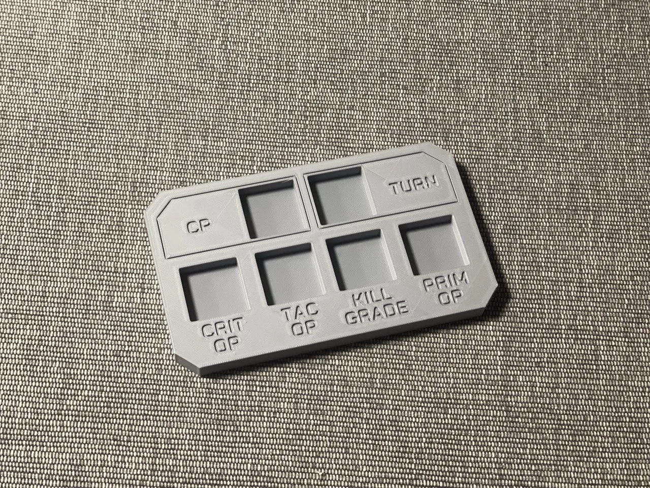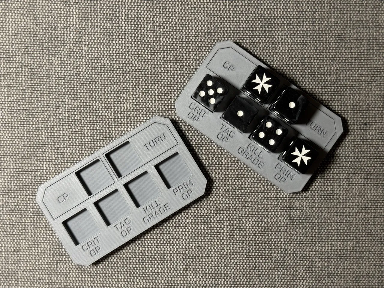 Theo dõi này được thiết kế để sử dụng với xúc xắc 16mm và giúp theo dõi điểm chiến thắng, điểm chỉ huy, và lượt hiện tại trong các trận đấu Phi đội của bạn.