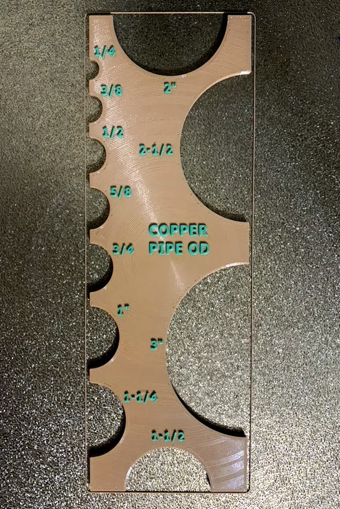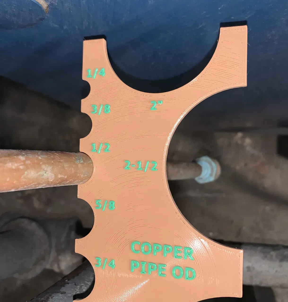 Đây là thiết kế gốc của tôi. Nó giống như một mẫu hình tròn. Các hình tròn phù hợp với đường kính ngoài của ống đồng được làm theo tiêu chuẩn gage imperial. Đây là một công cụ cần thiết. Tôi cần một cách nhanh chóng để kiểm tra từng đoạn ống đã được lắp đặt. Tôi không thể kiểm tra ren hoặc kích thước bên trong vì nó đã được lắp ráp và lắp đặt. Tôi không có quyền truy cập vào các ren hoặc bên trong. Tôi đã tạo ra một dụng cụ để đo kích thước bên ngoài. Tôi đã thêm rất nhiều kích thước bổ sung vào dụng cụ của mình. Nó thật tuyệt vời. Tôi có thể kiểm tra ống trước và không lãng phí thời gian hay vật liệu để cố gắng lắp đặt các ống không vừa. Khi sử dụng, hình bán nguyệt nên vừa khít gần như chính xác. Bạn có thể mang nó đến Home Depot, Lowes, hoặc cửa hàng vật liệu khác để kiểm tra dụng cụ của bạn trên các ống của họ và xác minh rằng nó đã in đúng trước khi sử dụng. Tôi đã thêm một phiên bản Rev A cho các chữ cái nổi. Bạn có thể chuyển đổi filament để có độ tương phản màu sắc cao hơn cho các chữ cái. Bạn có thể xem dụng cụ của tôi để đo ống NPT mạ kẽm hoặc đen. https://www.f3d.vn/3d-model/152727-ufs-032-thuoc-do-duong-kinh-ong-den-npt-do-ngoai