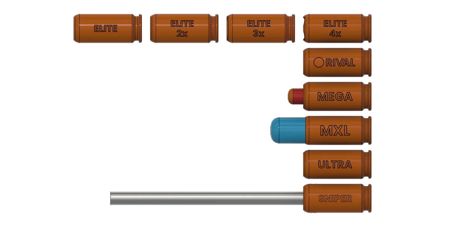 - Vỏ MXL: Bắn đạn MegaXL. * Cũng có phiên bản có rãnh xoắn để tăng độ chính xác.