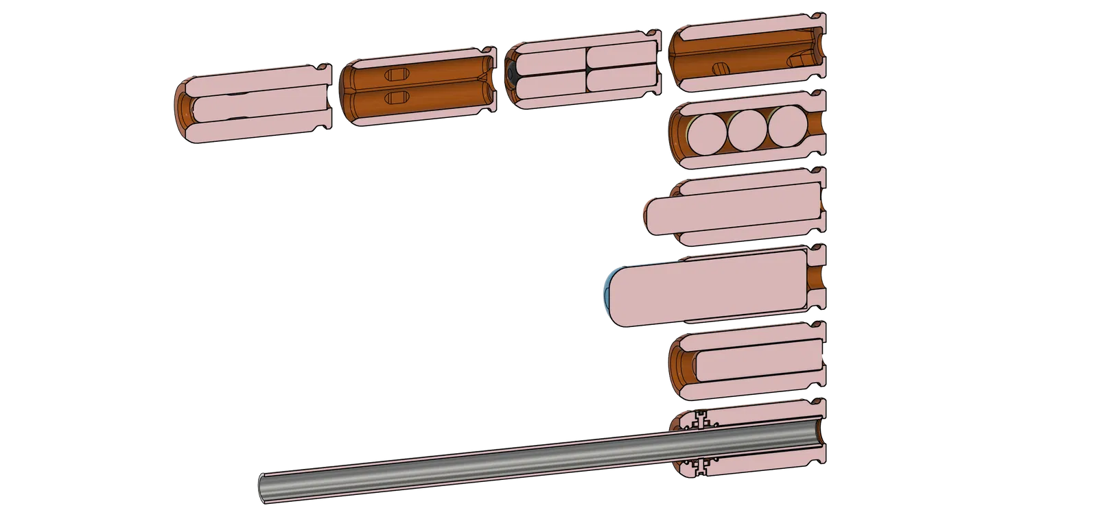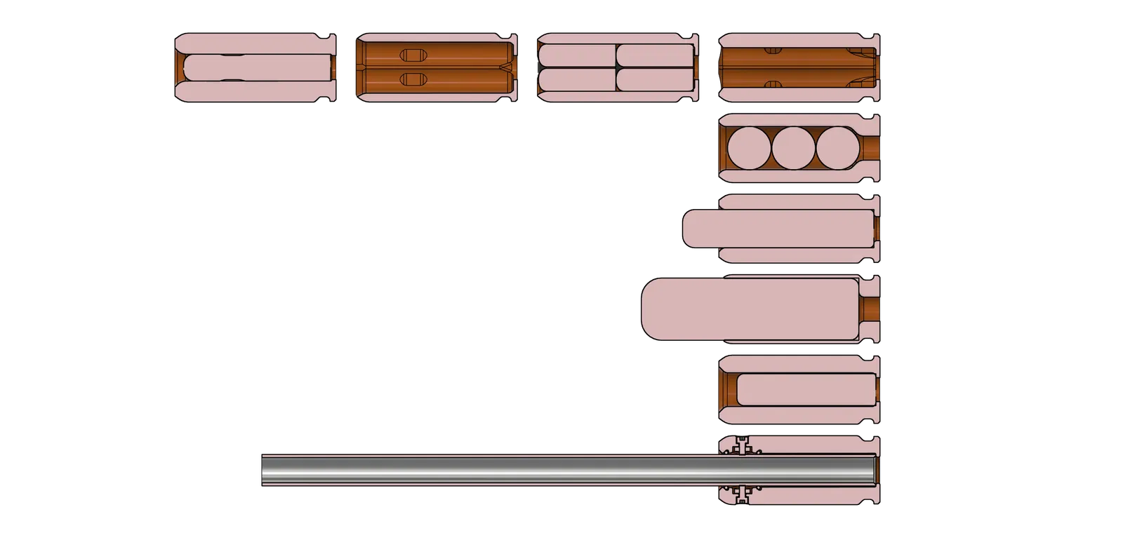 - Vỏ có hình học căn chỉnh ở cạnh ngoài để căn chỉnh chúng với nhiều nòng kín cùng lúc.