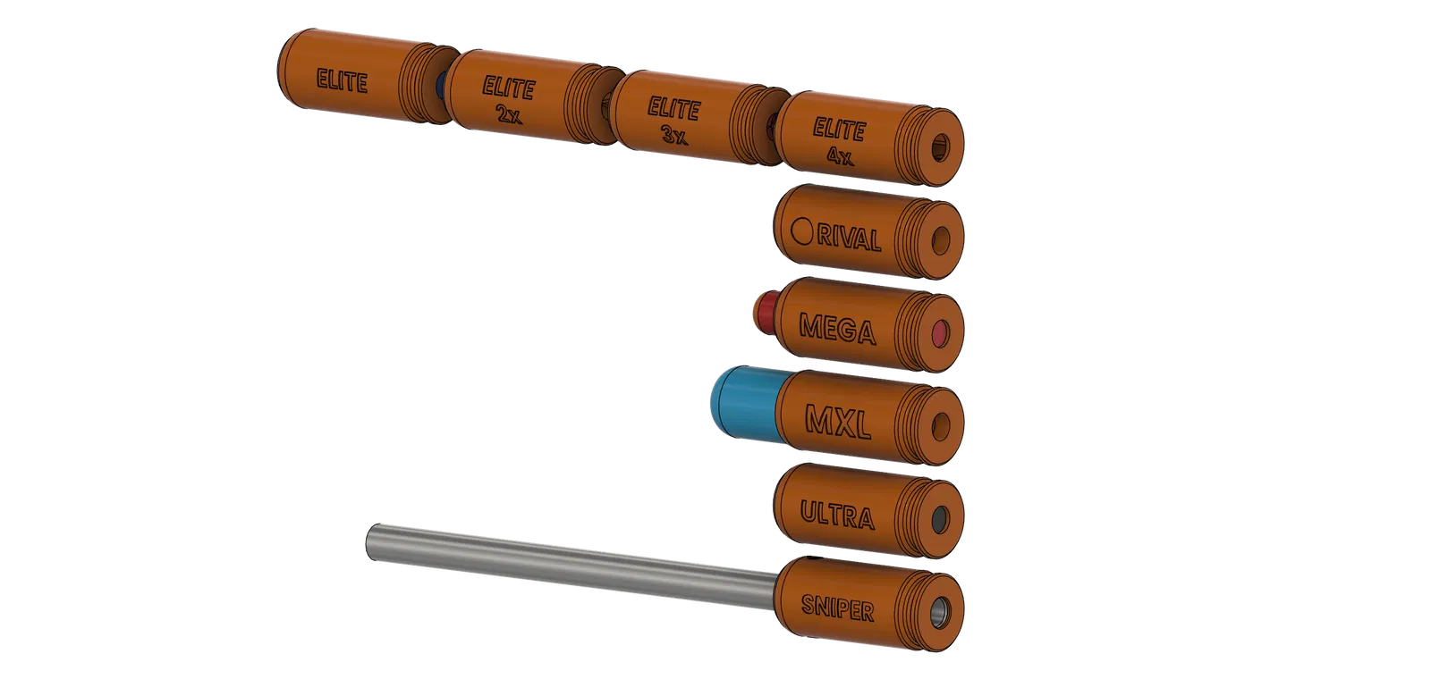 - Bottlenose: Tương tự vỏ Sniper, nhưng được in hoàn toàn (không có nòng nhôm). Có SCAR tích hợp để ổn định đạn. * Có nhiều độ dài Bottlenose khác nhau, cho các dải FPS khác nhau cho từng khẩu súng bạn sử dụng.