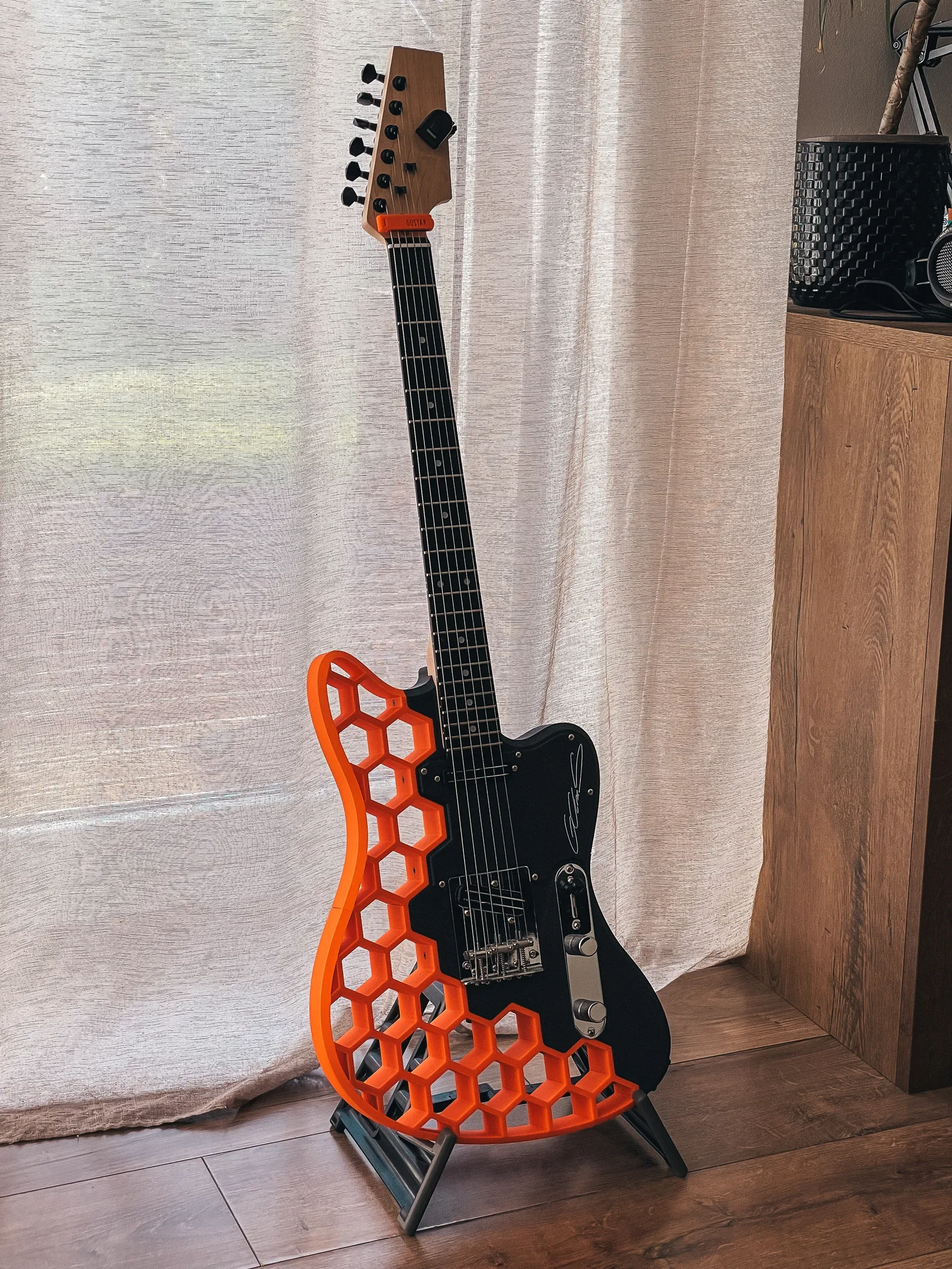 Thương hiệu là thứ tôi nghĩ ra và nó bắt nguồn từ tên tôi (Gustav) và từ "guitar". Tôi hiểu rằng một số người có thể không thích có bất kỳ thứ gì trên đó, nhưng tôi muốn làm cho nó mang tính cá nhân. Tất nhiên, bạn có thể lắp nó đảo ngược lại.
