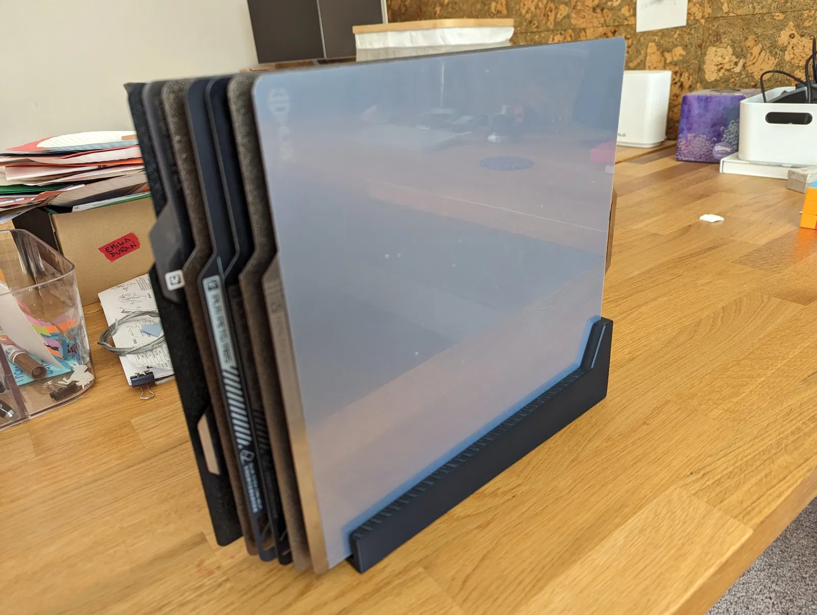 Đã thiết kế một bộ tổ chức đĩa cho nhu cầu cụ thể của tôi nhưng nó hoạt động rất tốt. Đây không phải là một thiết kế tinh vi nhưng rất chức năng, chứa được tối đa 8 đĩa, chúng được xếp chồng lên nhau để bạn có thể thấy đĩa nào bạn đang lấy.