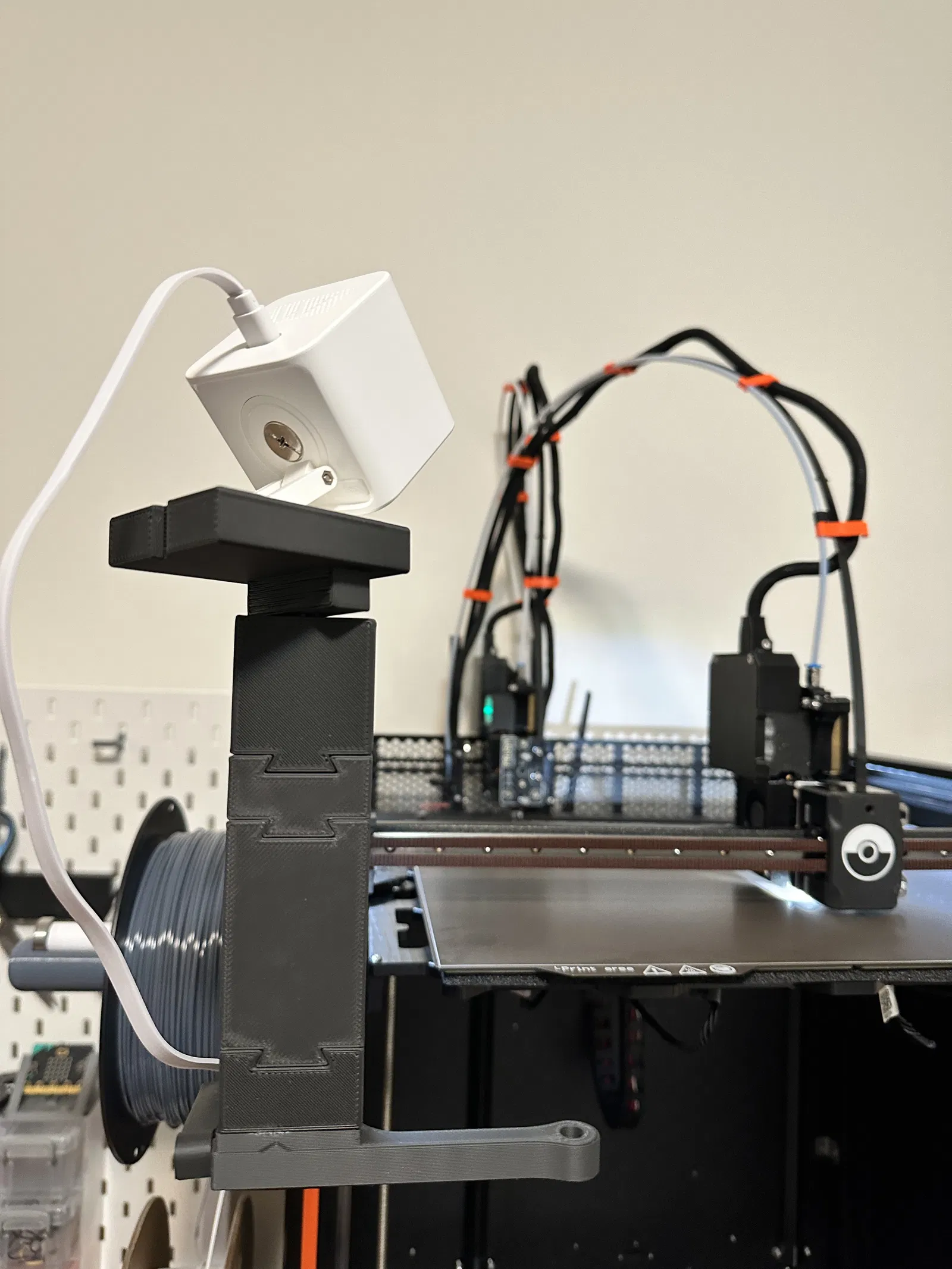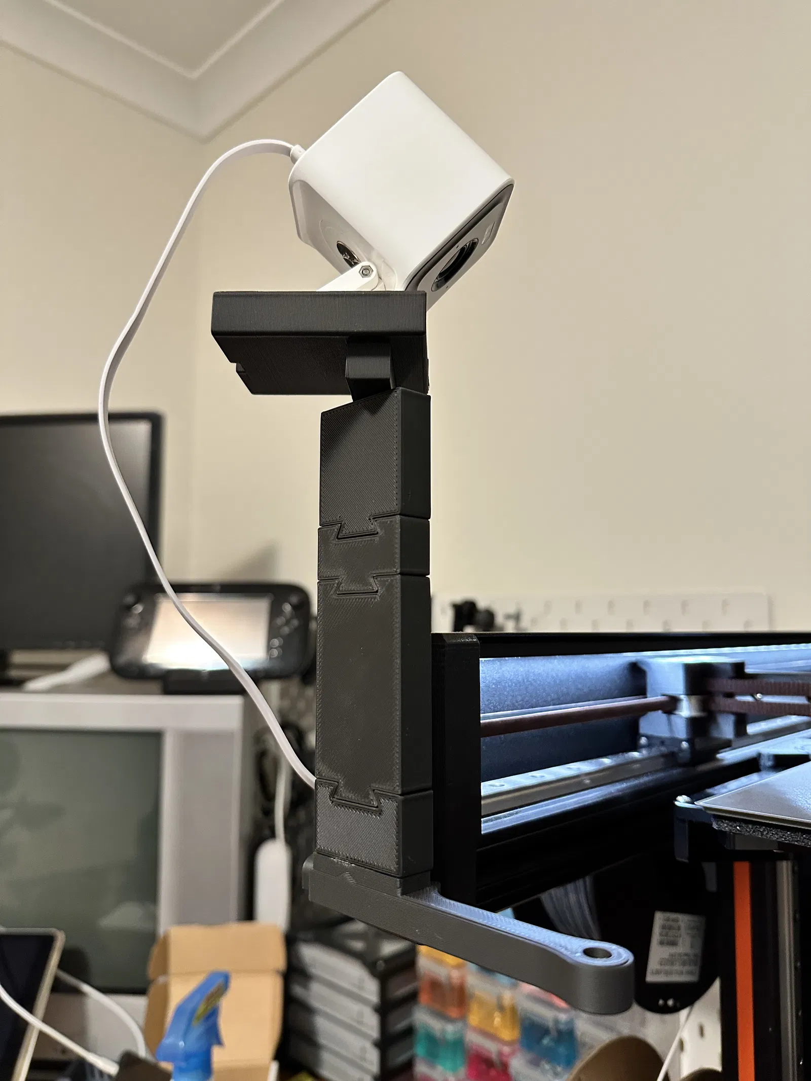 Sau khi cố gắng để vừa vặn, tôi nhận ra tùy chọn góc nhìn cao hơn có thể tốt hơn, vì vậy tôi đã thêm một cột dọc với giá đỡ camera Wyze ở trên cùng. Tôi vẫn sử dụng khóa vì tôi thích cơ chế này - cái này có thể được tìm thấy trong danh sách gốc trên Printables.