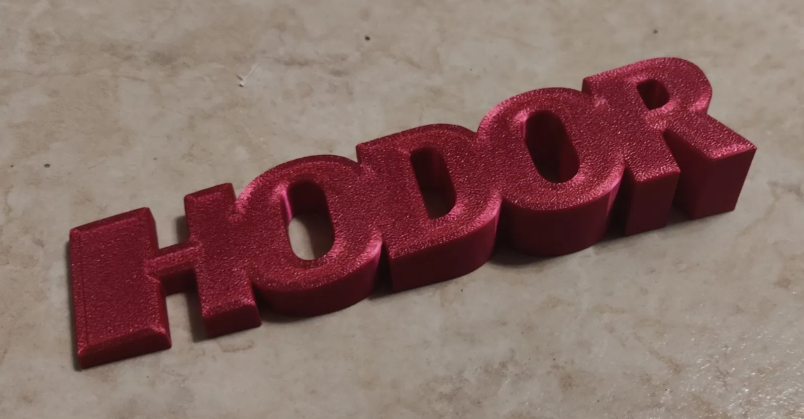 Tôi đã in HODOR ngược xuống, để có vân nổi ở trên. Tôi đã dùng 4 lớp ngoài và độ điền hợp lý để nó chắc chắn. Có lẽ hơi quá, nhưng chúng tôi thích nó.