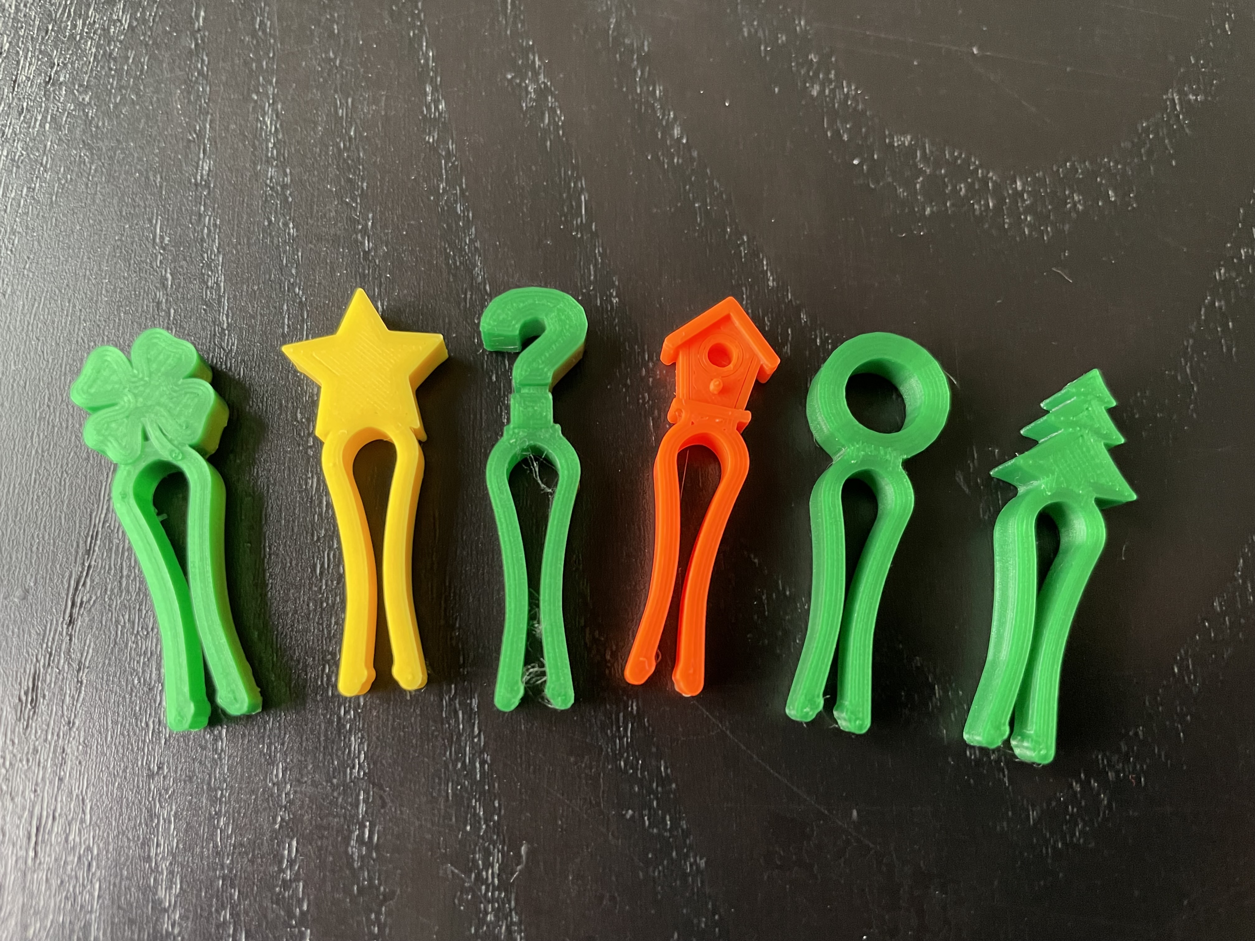 In bằng PLA, 0.05mm. Một số kẹp có hỗ trợ trên đế.