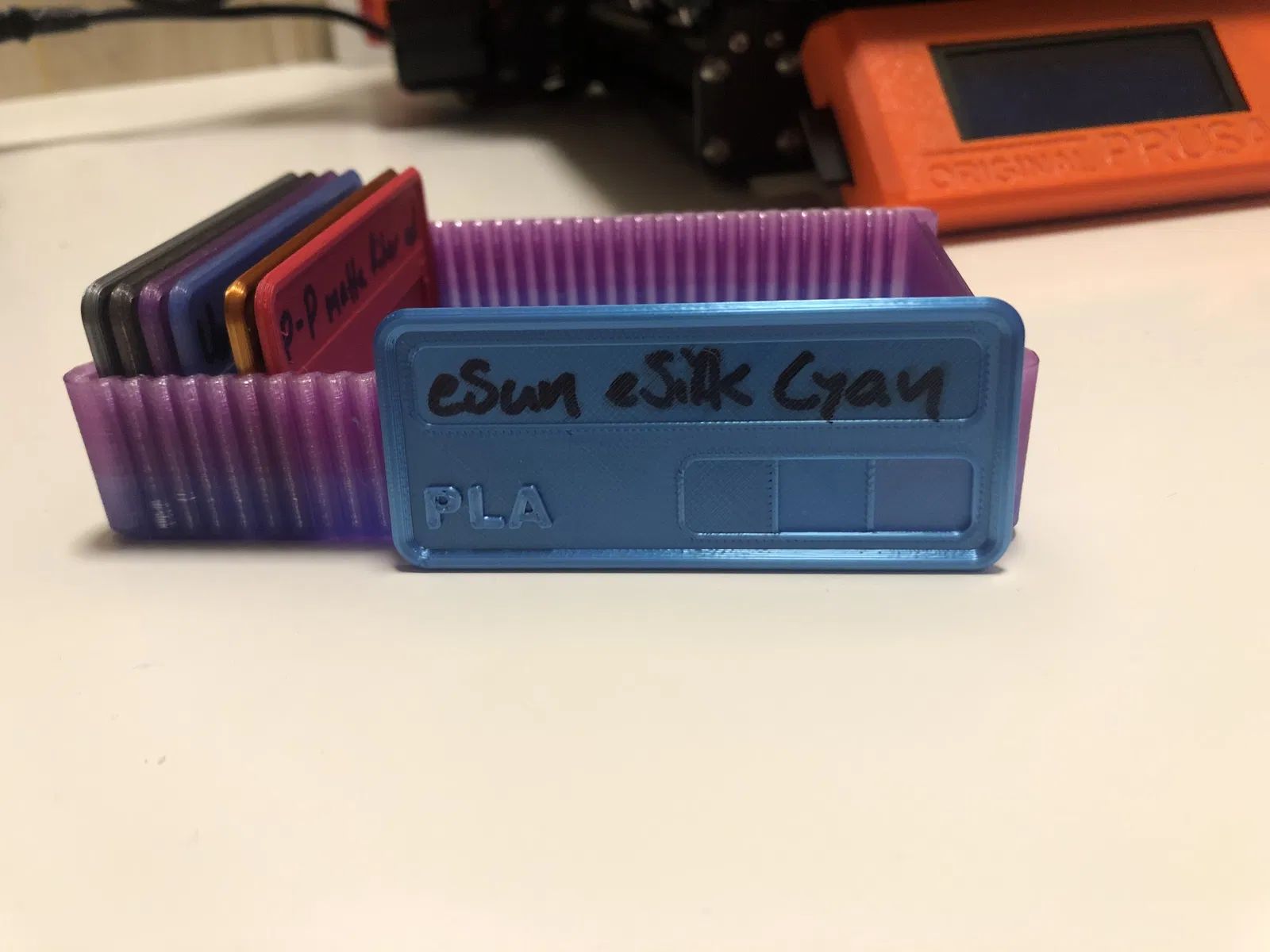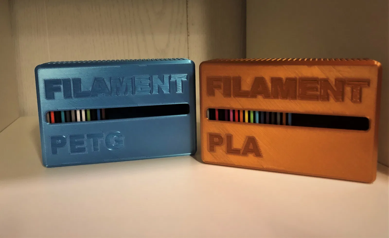 Cũng xem thêm hộp cứng cáp. Mẫu sợi nhựa với hộp đựng có chỗ cho 30 chiếc. Một mẫu PLA với cài đặt tiêu chuẩn cho Prusa mất khoảng 20 phút để in. Hộp đựng mất hơn 5 giờ. Ba trường dày 0,2, 0,4 và 1,0 mm. Một trường lớn hơn cho văn bản tùy chỉnh như thương hiệu, màu sắc, v.v. Có văn bản ở góc dưới bên trái ghi loại sợi nhựa. PLA, HTPLA, PETG, PET, PETT, ABS, HIPS, Wood, Metal, Flex và Nylon. Nếu bạn thiếu loại sợi của mình, hãy cho tôi biết trong phần bình luận. CẬP NHẬT 2019-09-28: Đã thêm đáy hộp v2 - Được làm để phù hợp với nắp/mặt trên Đã thêm nắp hộp có văn bản "Filament" Đã thêm nắp hộp có văn bản "Filament - PLA" Đã thêm nắp hộp có văn bản "Filament - PETG" CẬP NHẬT 2019-10-18: Đã thêm các loại sợi LDPE, HDPE và PP. CẬP NHẬT 2021-05-25: Đã thêm các loại sợi được yêu cầu PC, ASA, Carbon và Stone. CẬP NHẬT 2023-06-06 Đã thêm các loại sợi PC/ABS FR trong hai biến thể (văn bản nhỏ hơn và hai hàng), PETG CF, PC CF và PET CF. Đã sắp xếp các tệp vào thư mục. Đã đổi tên tệp để dễ nhận dạng hơn. CẬP NHẬT 2023-09-28 Đã thêm loại sợi PLA CF. ### Phần bổ sung và bản sửa đổi: Marker hiển thị bởi @Prokop Rất nhiều mẫu bổ sung, đã sửa đổi bởi @seemomster ### Hướng dẫn in ### Cài đặt in Rafts: Không Supports: Không Độ phân giải: 0.2 Infill: 15%
