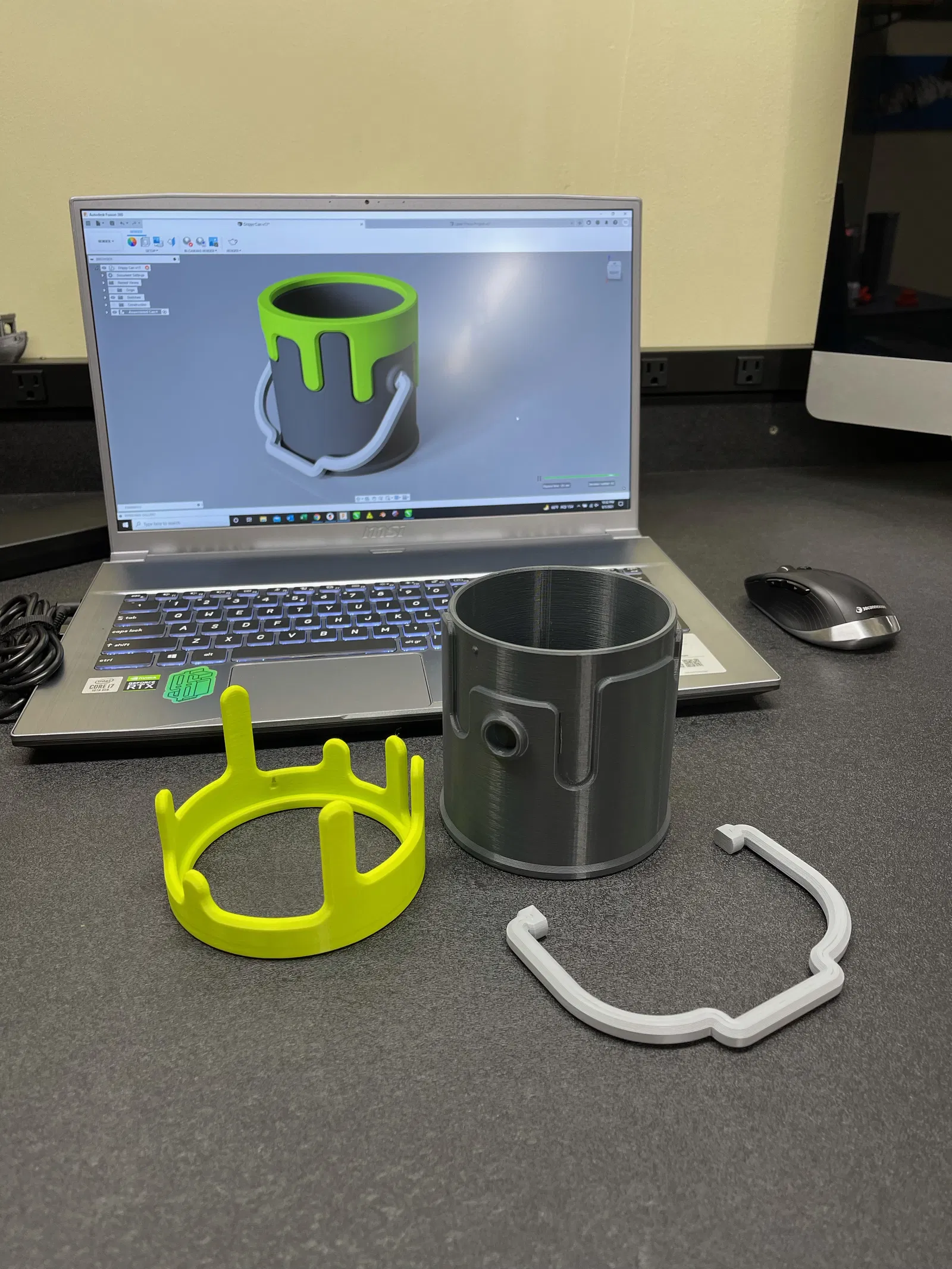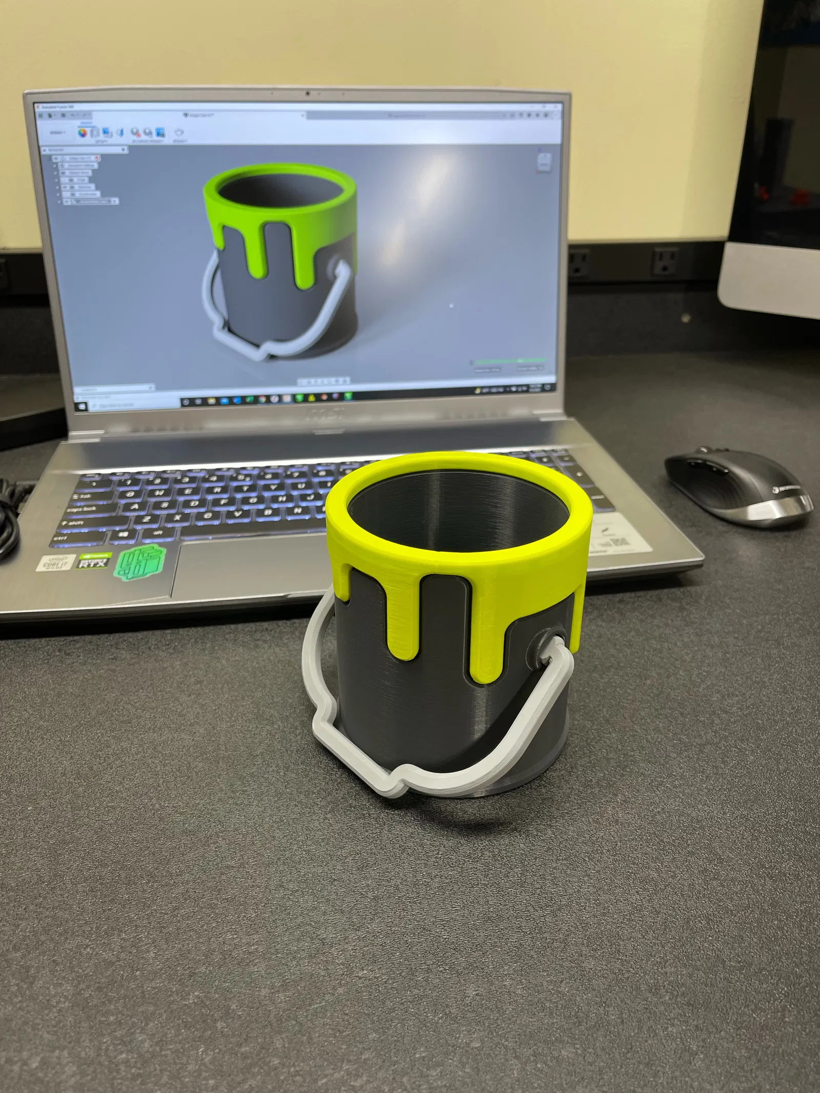 Tôi có một tầm nhìn về một chiếc xô sơn chảy theo phong cách pop-art, kỹ thuật số, minh họa và tôi đã phải biến nó thành hiện thực! Tôi đã thiết kế hoàn toàn chiếc xô này trong Fusion360 và in trên máy Prusa MK3S và MK3S+. Tất cả các bộ phận đều in và khớp với nhau tốt bằng PLA ở độ cao lớp 0.3mm, tôi không thể nói về các vật liệu khác như PETG, loại vật liệu này thường co lại nhiều hơn PLA một chút. Tôi đã sử dụng 3D Fuel Charcoal Gray, Lulzbot Green và Industrial Gray Pro PLA cho bản in trong ảnh. Không cần keo, tất cả đều là khớp nối. Không cần giá đỡ (supports).