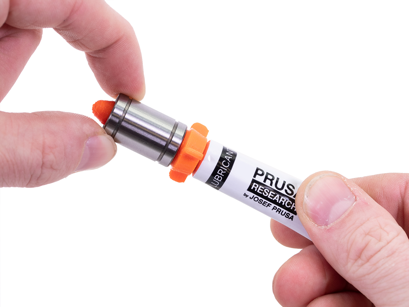 Vặn dụng cụ đã in vào tuýp Dầu bôi trơn Prusa, cẩn thận đặt ổ bi vào và xoay ngược chiều kim đồng hồ cho đến khi cảm thấy có lực cản nhẹ. Sau đó nhấn tuýp và quan sát đầu dụng cụ xem có dầu rò rỉ ra không. Khi dầu bắt đầu rò rỉ, ổ bi đã được bôi trơn đủ. Theo kinh nghiệm của tôi, một tuýp là đủ cho hai bộ ổ bi.