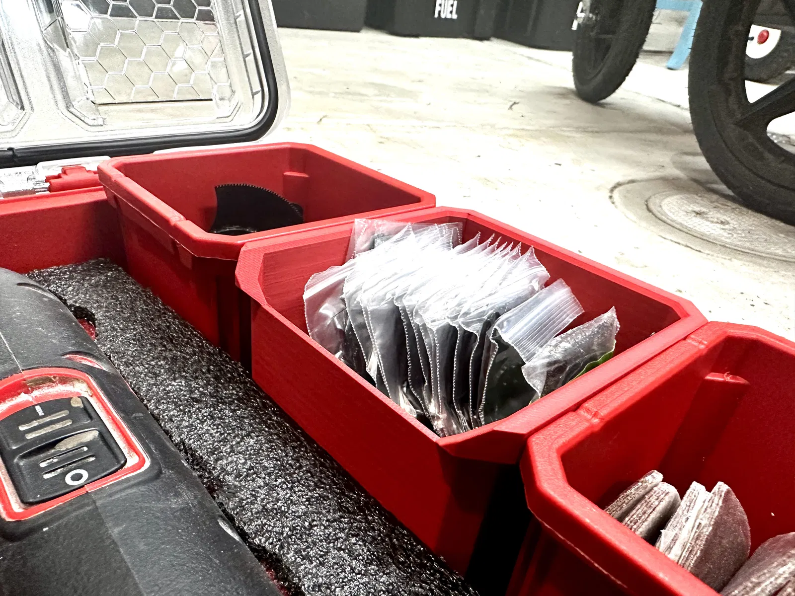 Cái khay sâu này có cạnh trên một bên bị khoét để có thể đặt vào phần giữa của thùng Packout. Giờ đây, khay lớn ở giữa có thể được thay thế bằng hai cái khay này.