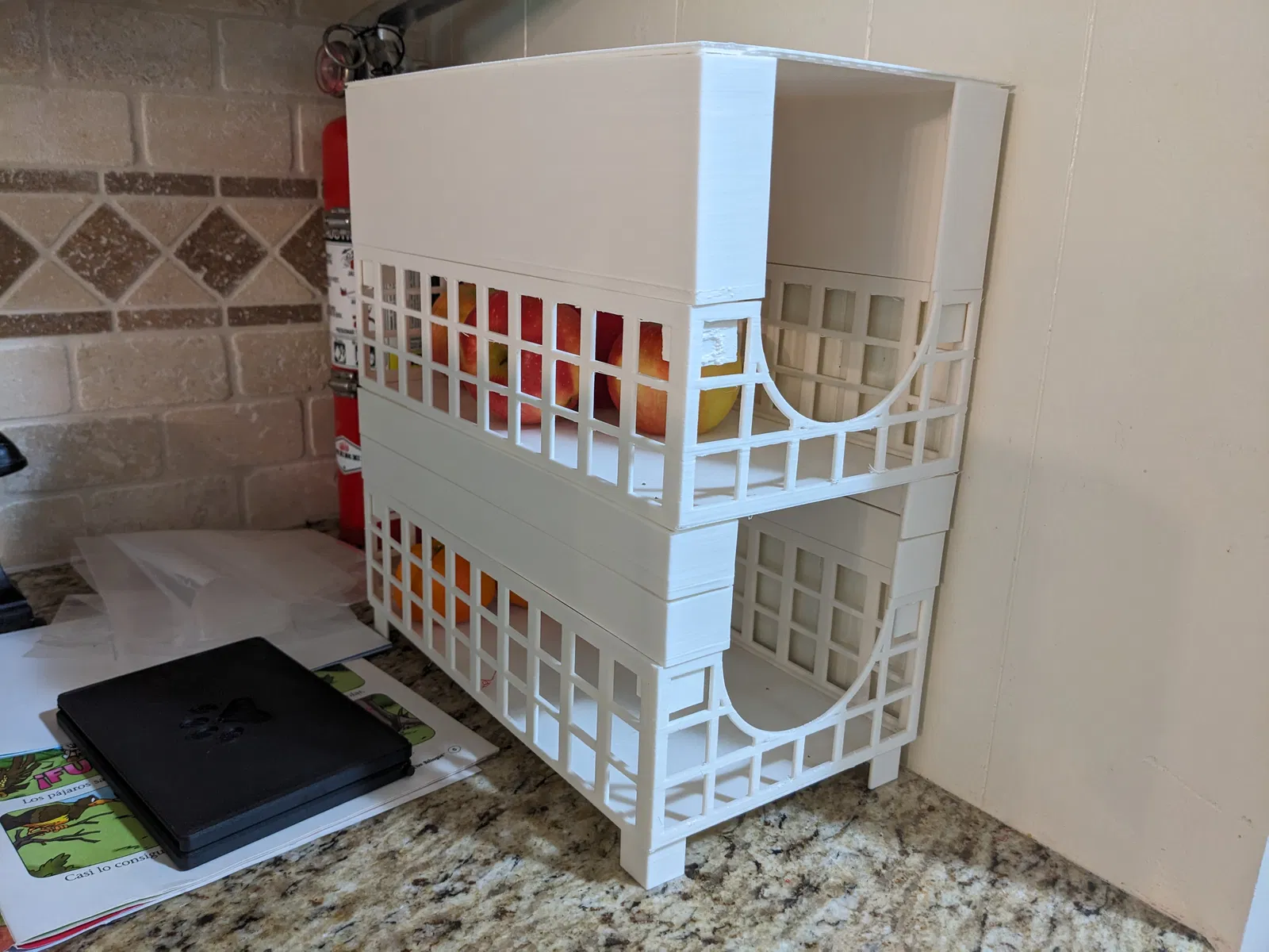 CẬP NHẬT LÊN V2 Đây là một loại rổ được tạo ra để lũ trẻ con chạy quanh nhà không phải loay hoay với những túi đựng trái cây mua ở siêu thị. Ngoài ra, vì bếp nhà tôi nhỏ, đây là một cách tiết kiệm không gian để chứa tất cả trái cây. Phần có lỗ cần rất nhiều vật liệu hỗ trợ, vì nó được thiết kế để "thoáng khí". Phần mặt phẳng cần được dán keo siêu dính vào phần có lỗ. Các bộ phận khác dùng để lắp vào tùy theo chiều cao bạn cần. Độ dày của nhựa là 0.1 inch. Tôi đã dùng Polymaker Polyterra Matte White cho sản phẩm của mình. Trông rất đẹp.