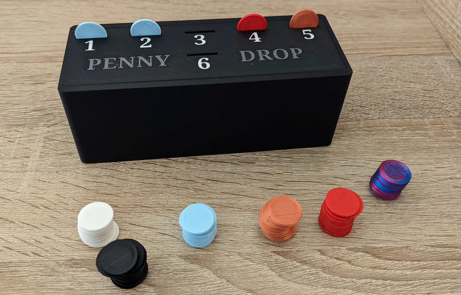 Đã chuyển đổi tệp gốc trong Tinkercad để có thể in trò chơi Penny Drop bằng Đa sắc / Đa vật liệu bằng các máy in như Bambulab P1P hoặc X1C. Tôi cũng đã tạo thêm một vài đồng xu trong Tinkercad và in chúng trên các mảnh PLA còn lại. Bản thân trò chơi chủ yếu được tôi in bằng PLA mờ của Sunlu. Tôi cũng đã in bảng cắm pegboard cho P1P bằng vật liệu này. <3