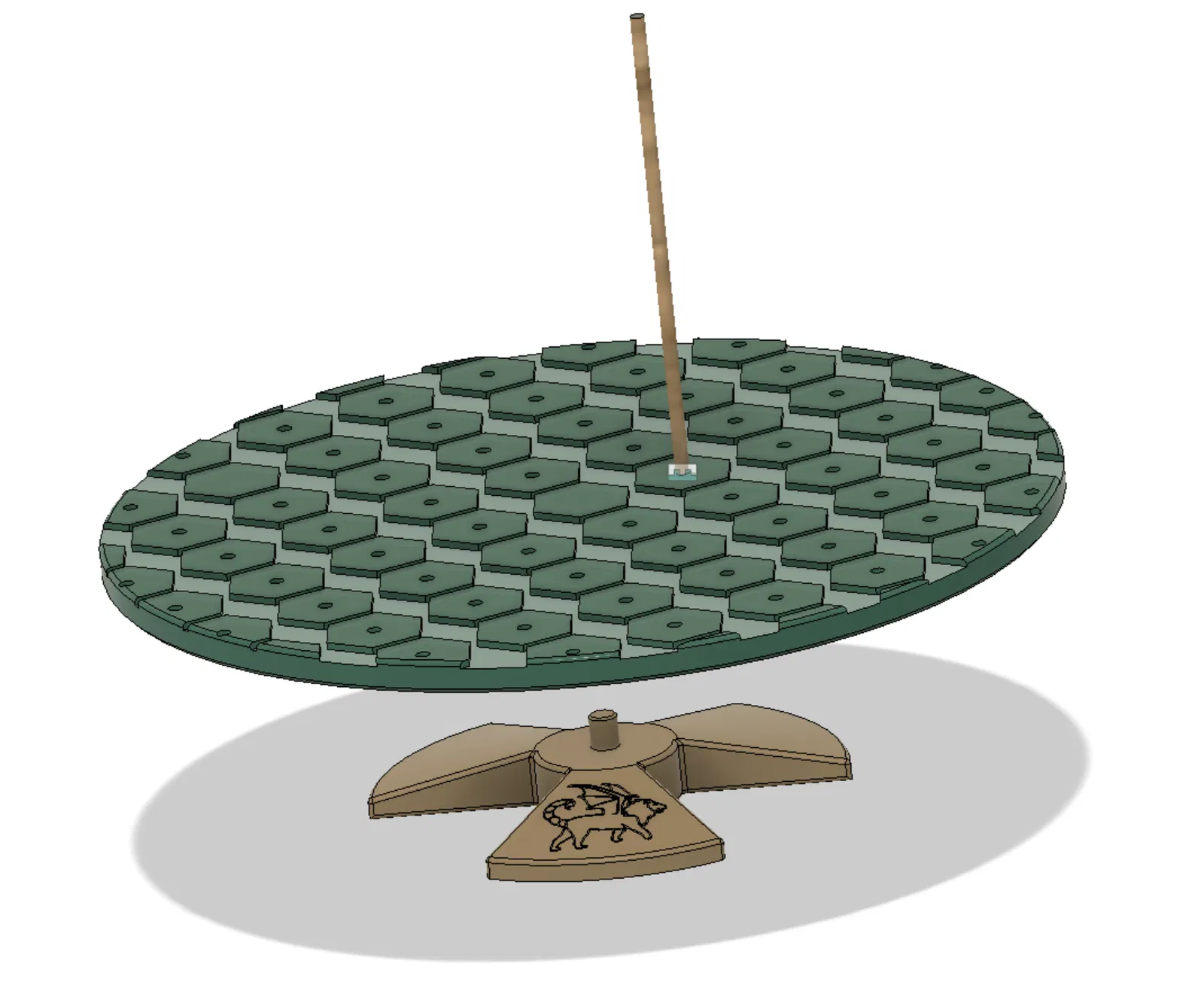 Bạn chỉ cần dán Vòng ngoài của Vòng bi vào Bộ phận Bàn xoay và Bộ phận Đáy vào Vòng trong của Vòng bi. Bàn xoay có nhiều lỗ 3mm để cắm que với các bộ phận bạn muốn làm khô sau khi sơn. Nó cũng có một Mẫu hình đa giác hình lục giác để giảm bề mặt của vật được sơn nhằm dễ dàng gỡ bỏ hơn. Tôi đã tạo Dấu ấn của mình (một con Manticore) ở Bộ phận Đáy. Nếu cần một cái không có, cứ cho tôi biết.