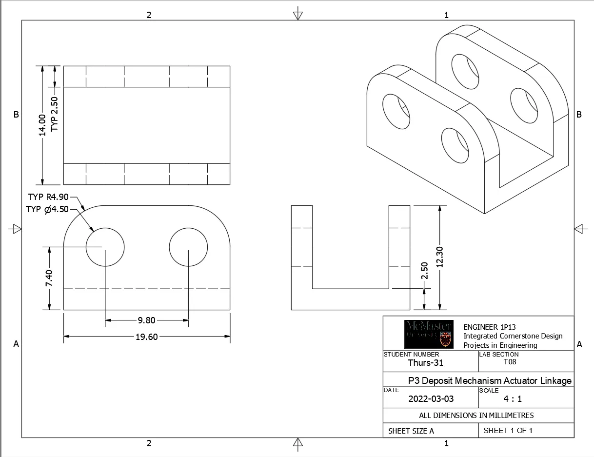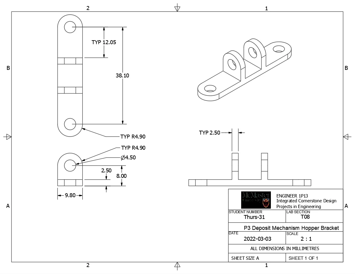 Một cơ chế để nạp vật liệu cho việc tái chế được gắn trên một con robot trang bị một thùng tái chế. Điều này được thực hiện cho dự án lớn thứ ba trong khóa học kỹ thuật năm nhất ENGINEER 1P13 tại Đại học McMaster. Con robot này sẽ đi theo các đường kẻ và phân loại các vật phẩm tái chế vào các thùng khác nhau sau khi nhận chúng từ một cánh tay robot sẽ nạp chúng vào phễu ở phía trên. Sử dụng đai ốc và bu lông M4 (dài 20 mm) để gắn kết cơ chế lại với nhau.