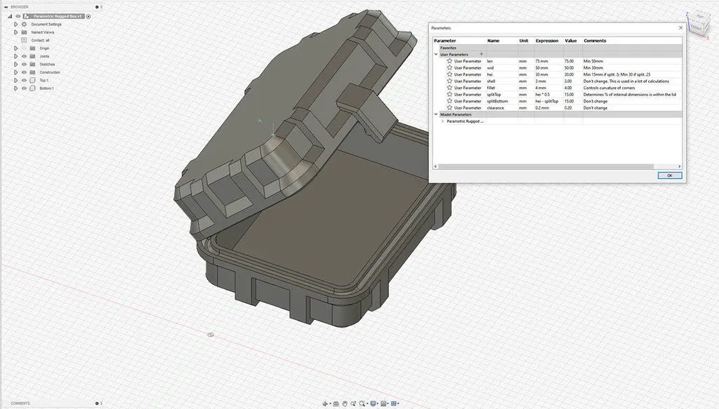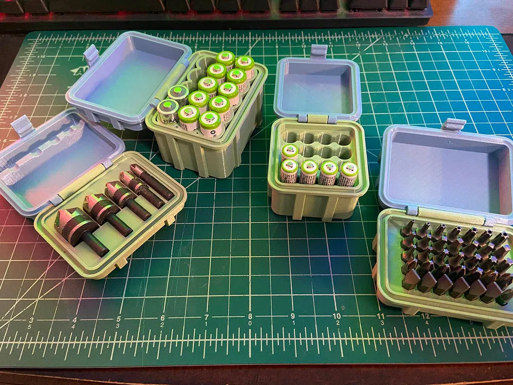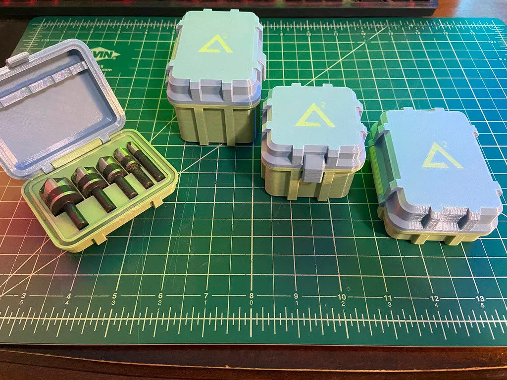 Hộp cứng cáp có thể tùy chỉnh theo thông số, được in bằng PETG để đảm bảo độ mềm dẻo cần thiết cho bản lề bi khóa khi lắp ráp. Hướng dẫn in và tóm tắt chi tiết được cung cấp, cùng với lời nhắc đọc ghi chú thông số và chia sẻ các bản chỉnh sửa.