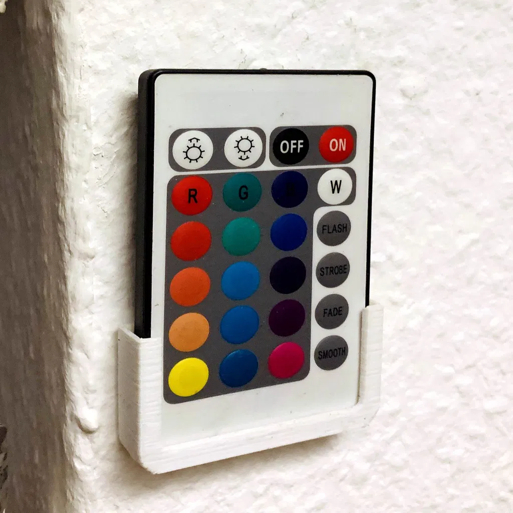 Giá đỡ điều khiển từ xa LED rất đơn giản. Giá đỡ này có thể được gắn bằng băng dính hai mặt, hoặc sử dụng tệp STL có lỗ để gắn bằng vít. In úp ngược để tránh giá đỡ cho cầu phía trước và có được sự vừa vặn hoàn hảo.