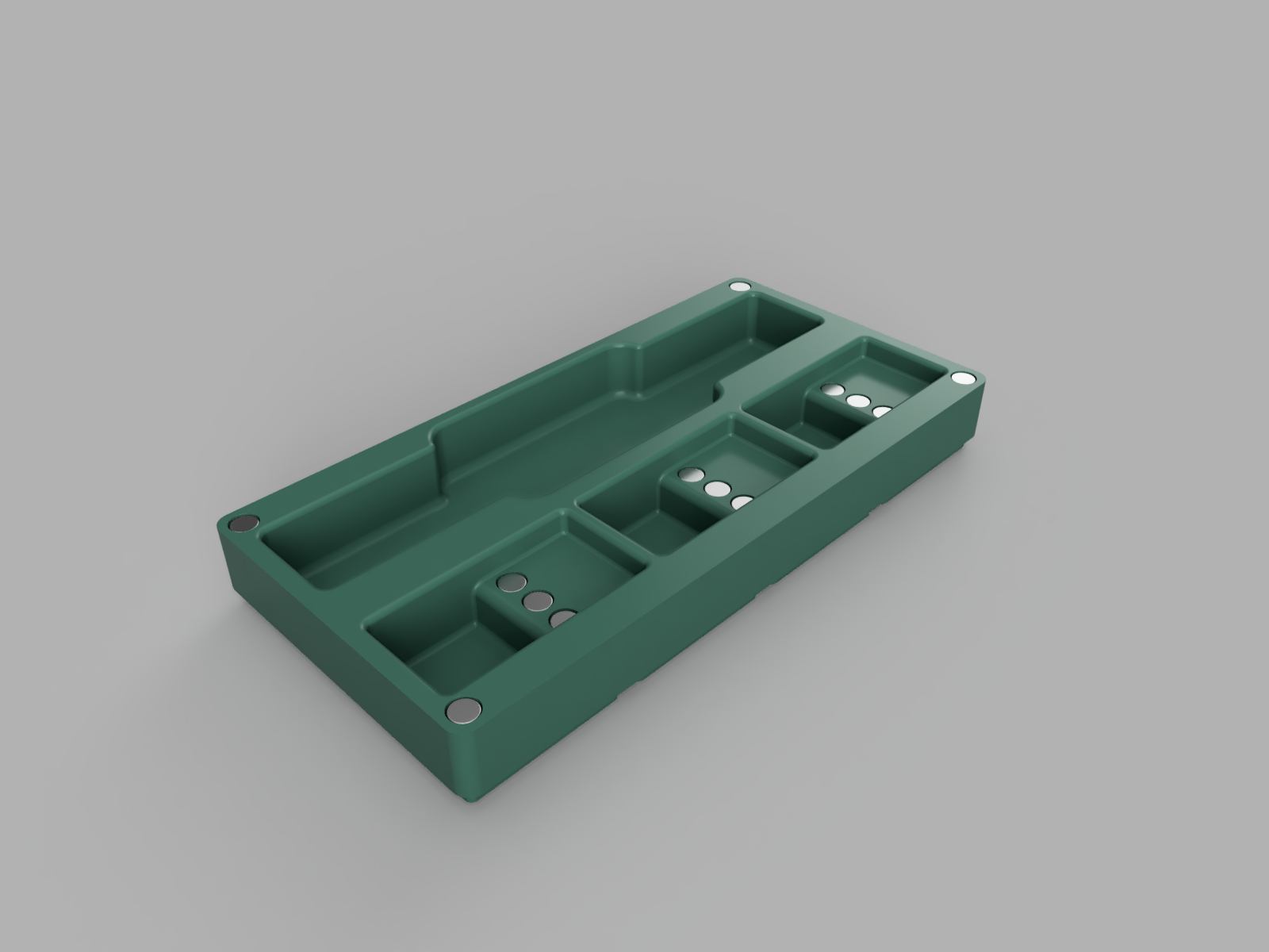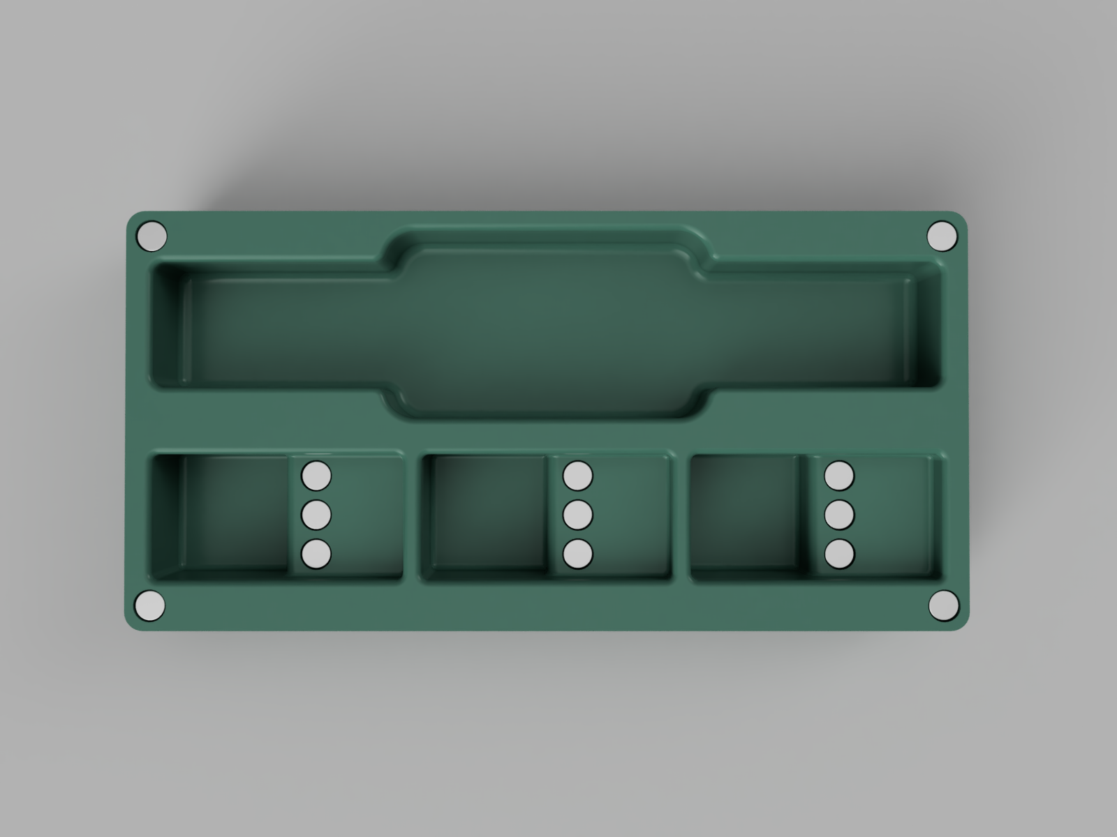 Hộp đựng dụng cụ gọt ba via tương thích với hệ thống Gridfinity. Chỉ sử dụng nam châm 6x2 để giữ nắp và các bộ phận dự phòng. Vỏ có kích thước 2x4x4U, lỗ dụng cụ bên trong 25 x 157,5 x 21 mm và sử dụng tổng cộng 17 nam châm.