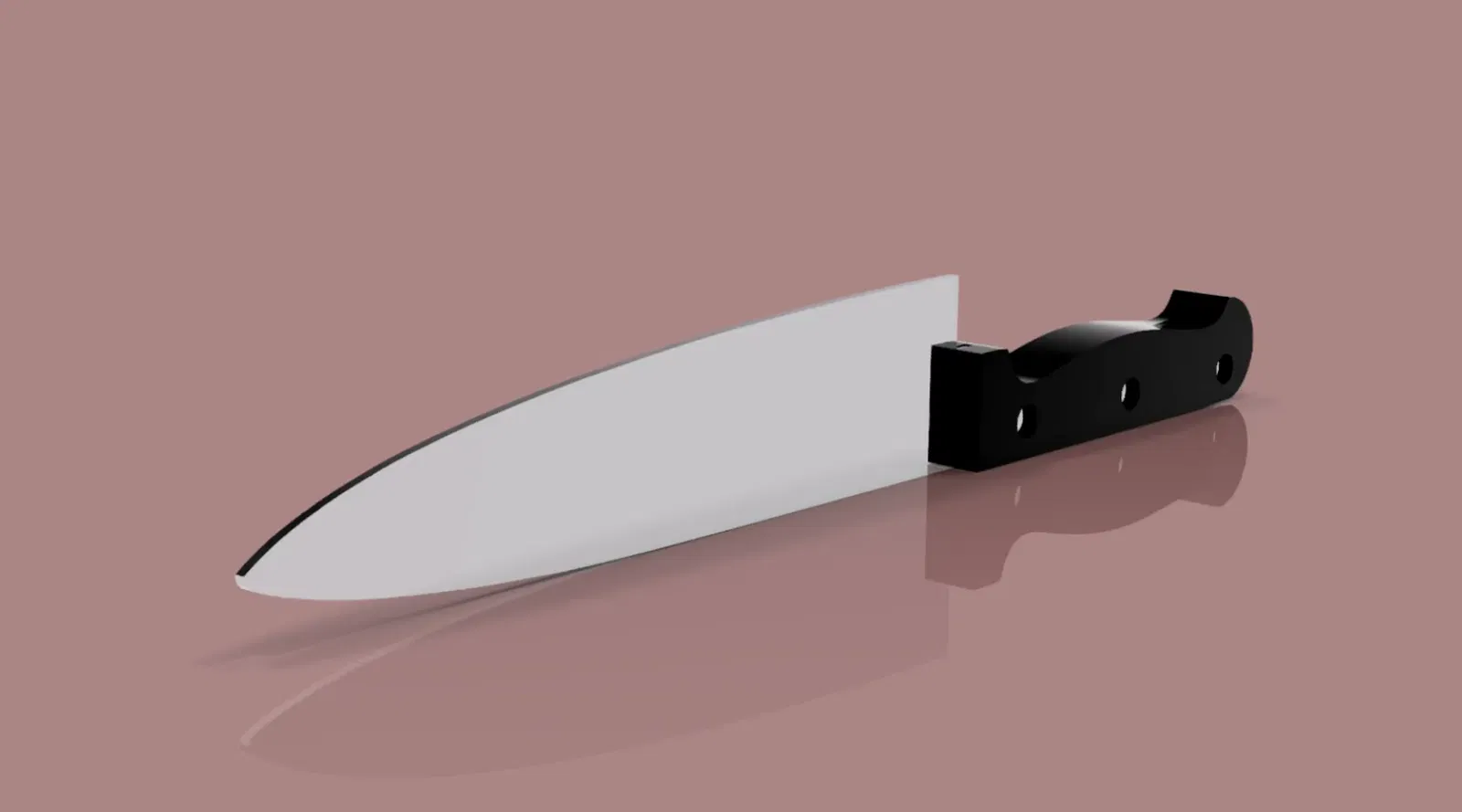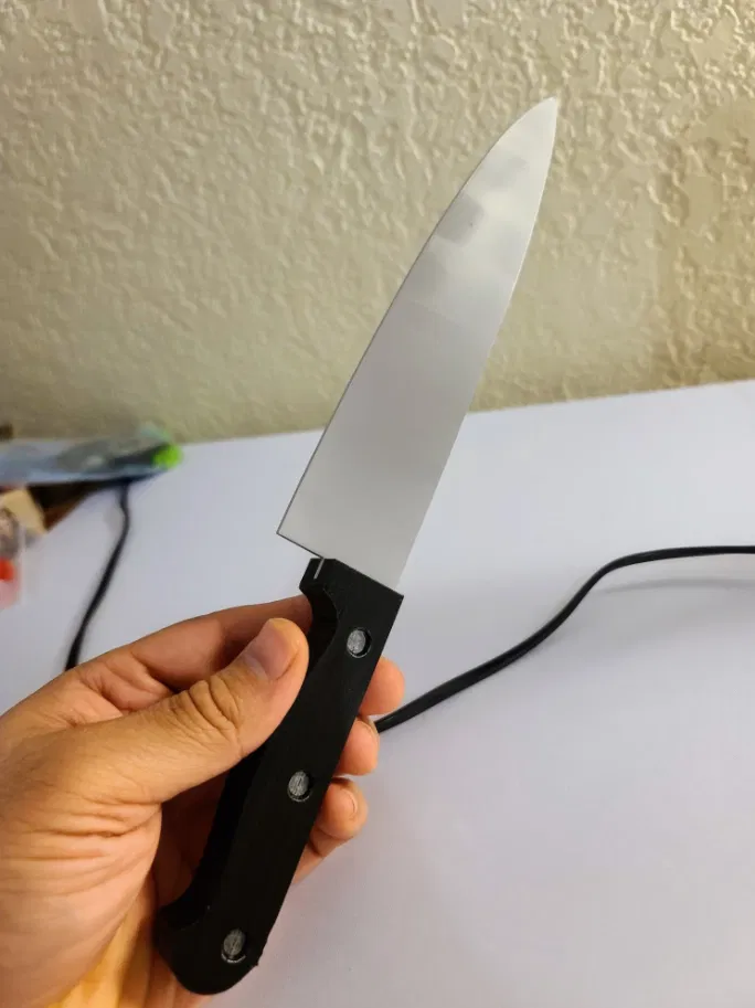 Dao đạo cụ để hóa trang hoặc trang trí. Dao bếp này có hai tay cầm, một cái tách rời và một cái liền. Cần dán lại với nhau khi in.