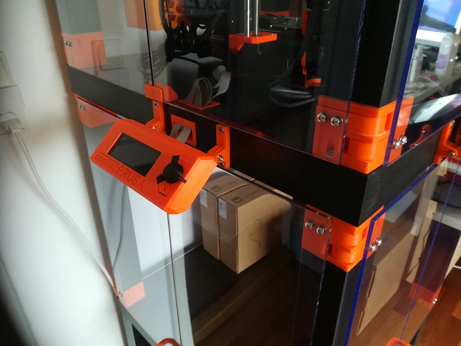 Giá đỡ màn hình LCD Prusa gốc đặt giữa hai tầng bàn LACK, khi xếp thêm các vỏ máy chồng lên nhau. Có thể xoay lên xuống để cửa vỏ máy đóng mở.
