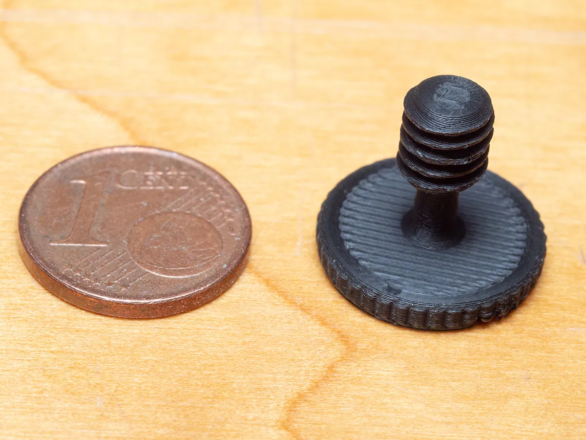 Đây là một vít máy ảnh tiêu chuẩn, tương tự như vít đi kèm với hầu hết các chân máy. Phần đầu vặn có vân là một thử thách thực sự cho máy in FDM. ;) Vì kích thước rất nhỏ, tôi khuyên bạn nên in với độ phân giải cao nhất/chiều cao lớp thấp nhất mà máy in của bạn có thể đạt được. Bộ phận trong ảnh được in ở mức 0,08 mm bằng đầu phun 0,4 mm. Và không, bạn không cần bất kỳ bộ phận hỗ trợ nào để in bộ phận này. Và nhân tiện: Không, khi in ren vít, một đầu phun mảnh hơn không có lợi ích gì cả - độ bám dính lớp tốt nhất trong trường hợp này đạt được với đầu phun 0,6 mm trong khi đầu phun 0,4 mm cung cấp sự cân bằng tốt nhất giữa chất lượng ren và chi tiết vân. Sử dụng đầu phun 0,3 mm hoặc mảnh hơn sẽ tạo ra ren yếu hơn và nên tránh.