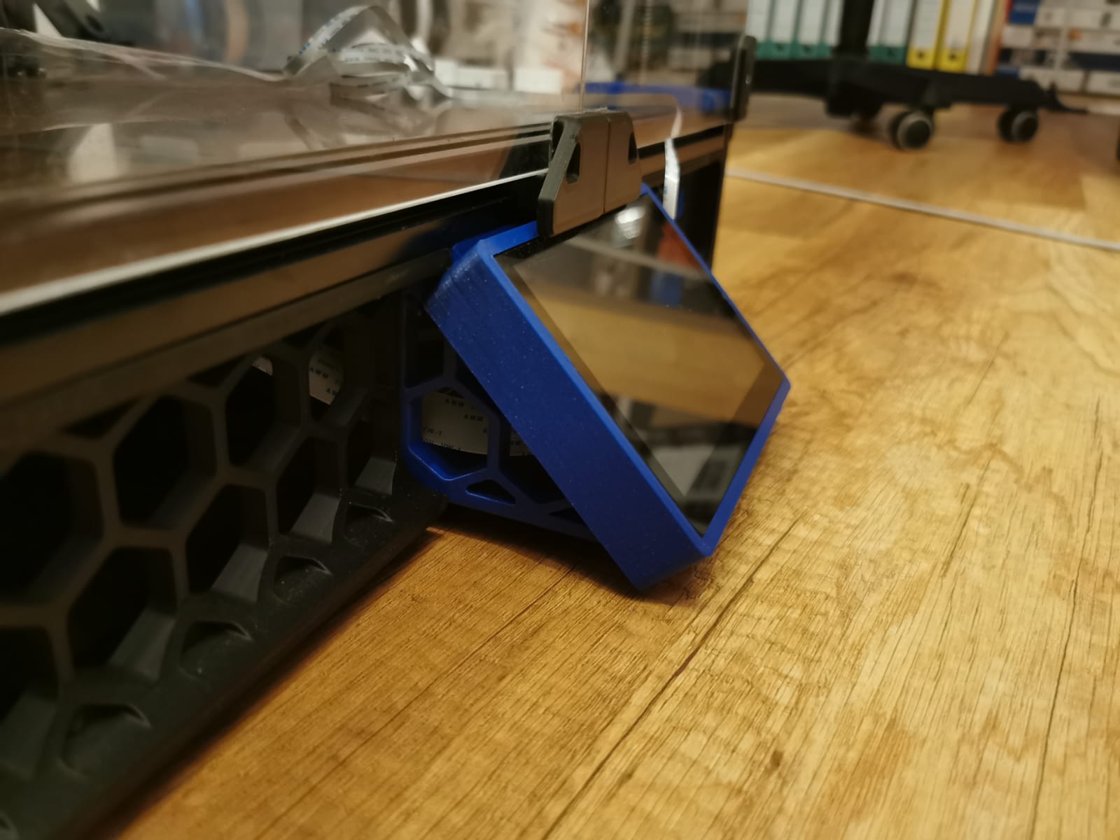 Nó được gắn vào Voron-Mod "BTT PITFT50 45-degree", có thể tìm thấy tại đây: https://github.com/VoronDesign/VoronUsers/tree/master/printer_mods/CannedBass/PITFT50_45_degree_mount