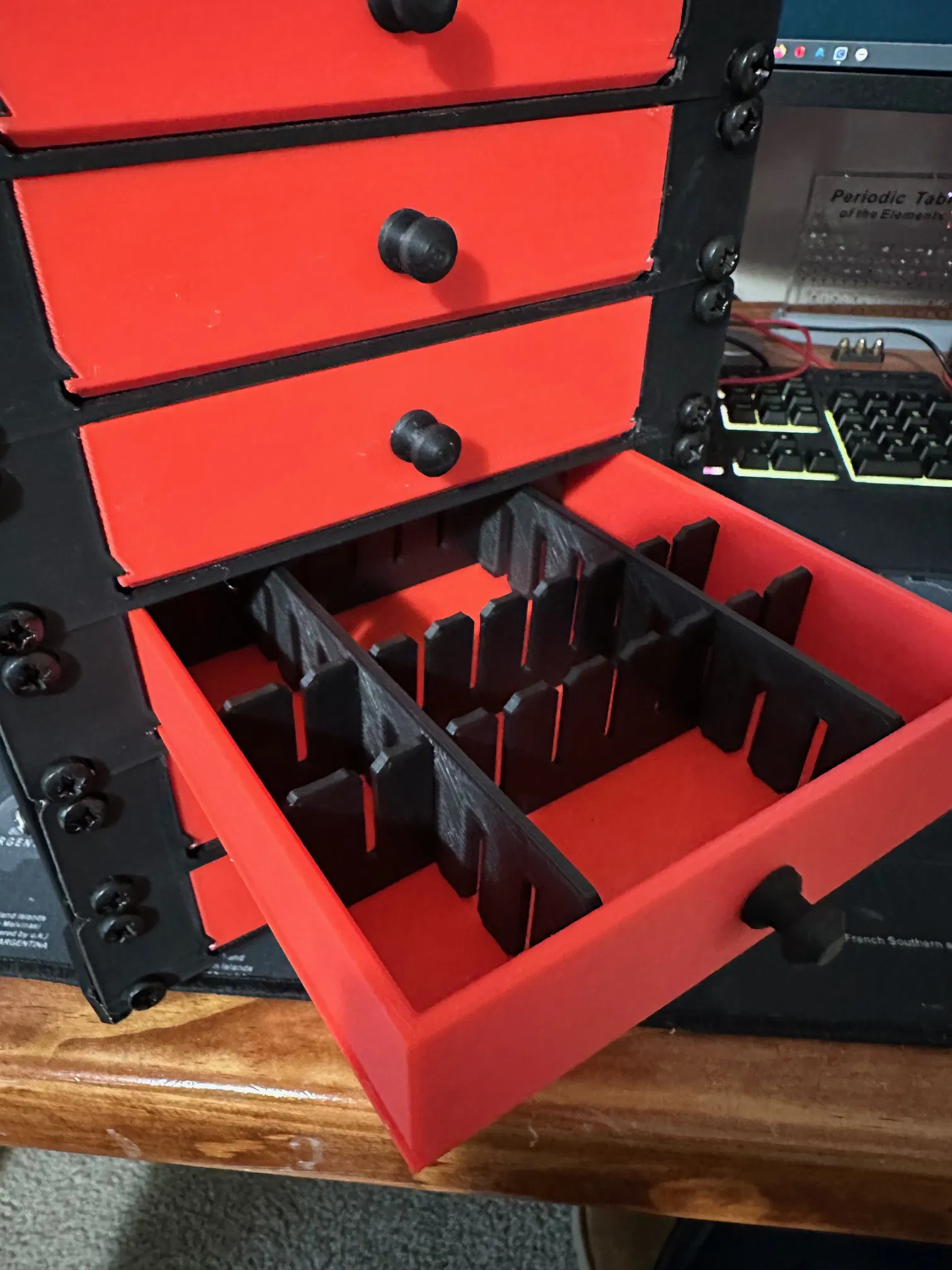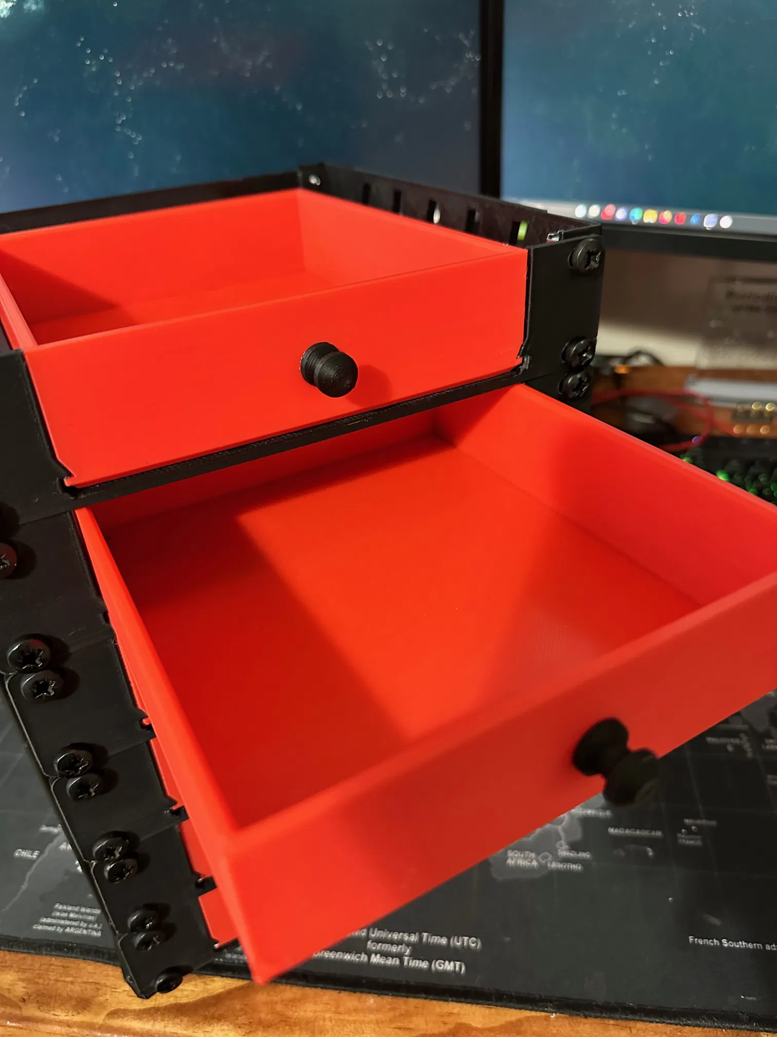 Thiết kế hệ thống ngăn kéo từ đầu, sử dụng các thanh ray máy chủ thừa. Ngăn kéo sâu 1,5 inch, mỗi kệ 1,75 inch (1U). Bao gồm cả hộp đựng đồ treo bên và các vách ngăn có thể điều chỉnh. Cần đai ốc lồng, bu lông và ốc vít cho núm.