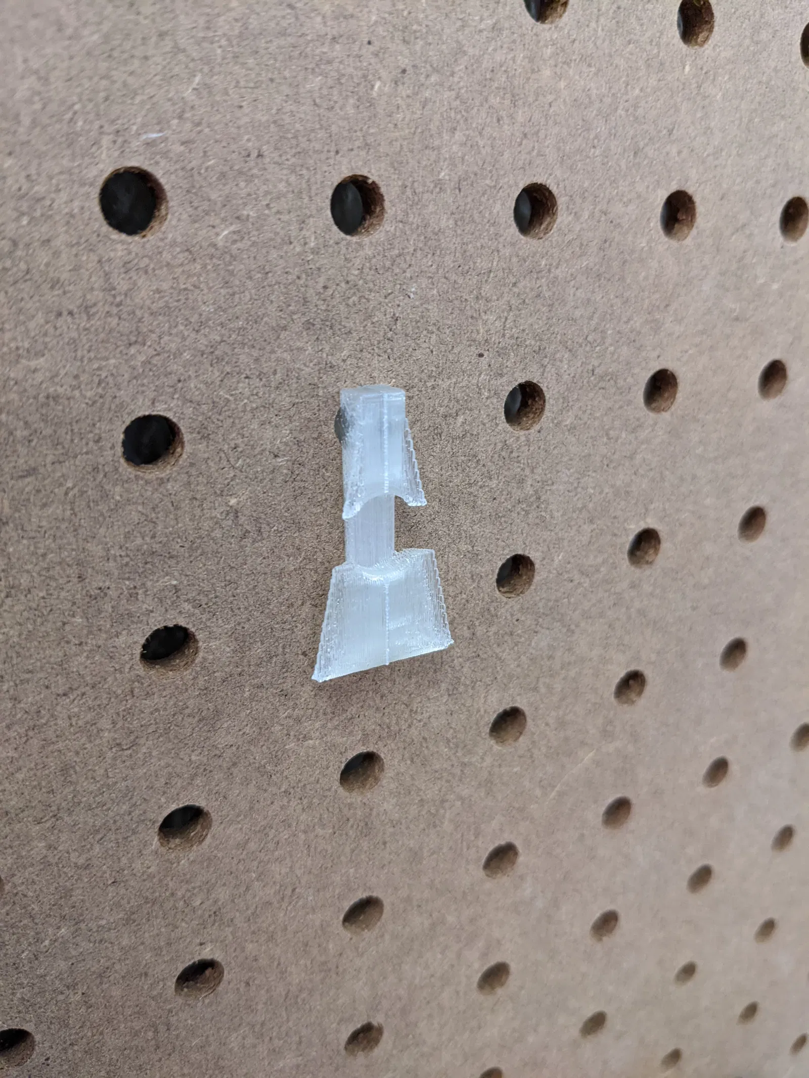 Tôi đã tạo ra hệ thống gồm hai bộ phận lồng vào nhau này sau khi nhiều giá đỡ pegboard in khác bị bung ra vào những thời điểm không thích hợp. Hệ thống này được gắn vào vị trí và khóa chặt, nén giá đỡ vào bảng và ngăn chặn chuyển động vô tình.