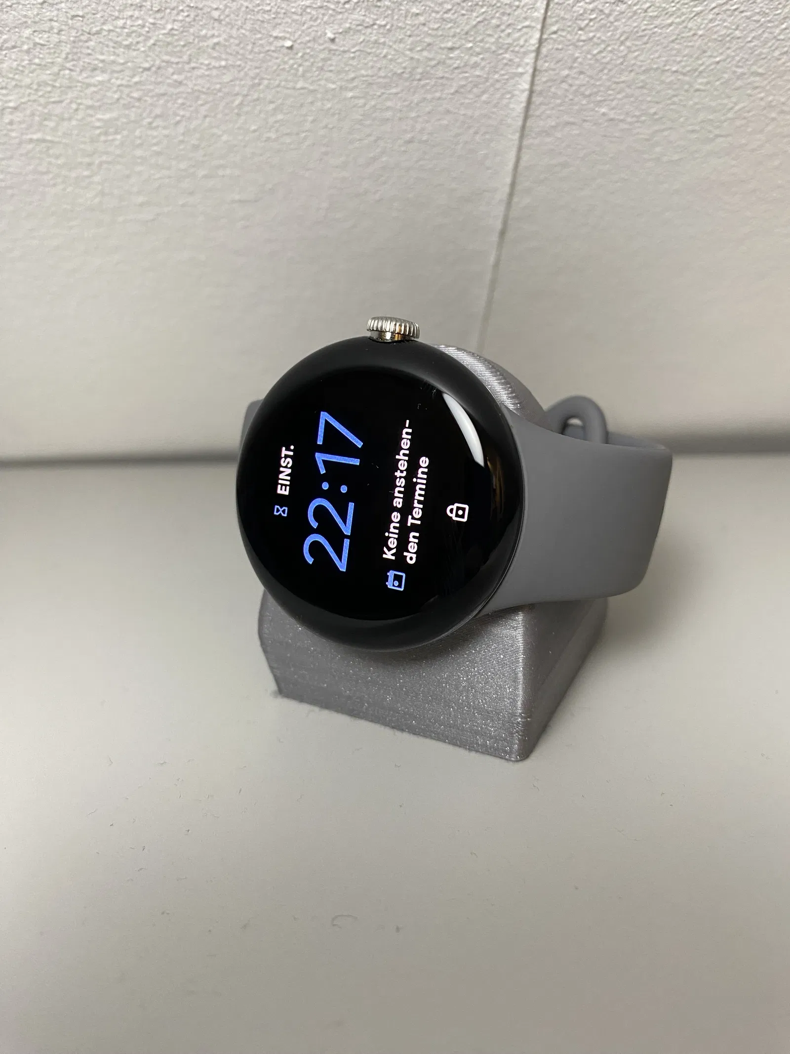Một bản chỉnh sửa từ "JDO Apple Watch Stand (series 1-7) plastic and metal charger compatible" để phù hợp với bộ sạc Pixel Watch. Giá đỡ này được thiết kế để giữ đồng hồ của bạn và bộ sạc gốc một cách gọn gàng và an toàn.